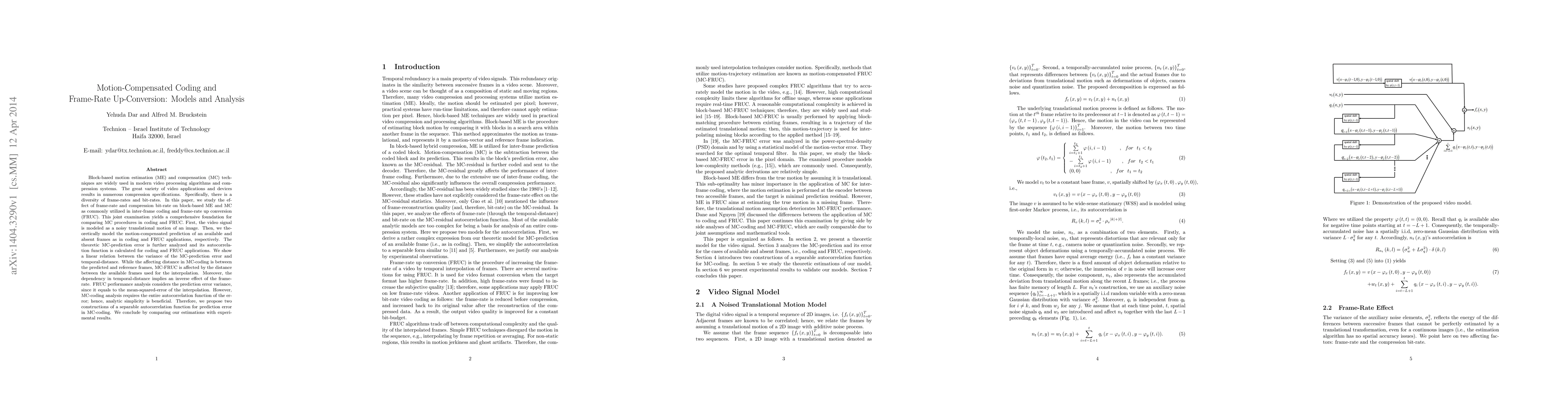 Block-based motion estimation (ME) and compensation (MC) techniques are widely used in modern video processing algorithms and compression systems. The great variety of video applications and devices results in numerous compression specifications. Specifically, there is a diversity of frame-rates and bit-rates. In this paper, we study the effect of frame-rate and compression bit-rate on block-based ME and MC as commonly utilized in inter-frame coding and frame-rate up conversion (FRUC). This joint examination yields a comprehensive foundation for comparing MC procedures in coding and FRUC. First, the video signal is modeled as a noisy translational motion of an image. Then, we theoretically model the motion-compensated prediction of an available and absent frames as in coding and FRUC applications, respectively. The theoretic MC-prediction error is further analyzed and its autocorrelation function is calculated for coding and FRUC applications. We show a linear relation between the variance of the MC-prediction error and temporal-distance. While the affecting distance in MC-coding is between the predicted and reference frames, MC-FRUC is affected by the distance between the available frames used for the interpolation. Moreover, the dependency in temporal-distance implies an inverse effect of the frame-rate. FRUC performance analysis considers the prediction error variance, since it equals to the mean-squared-error of the interpolation. However, MC-coding analysis requires the entire autocorrelation function of the error; hence, analytic simplicity is beneficial. Therefore, we propose two constructions of a separable autocorrelation function for prediction error in MC-coding. We conclude by comparing our estimations with experimental results.