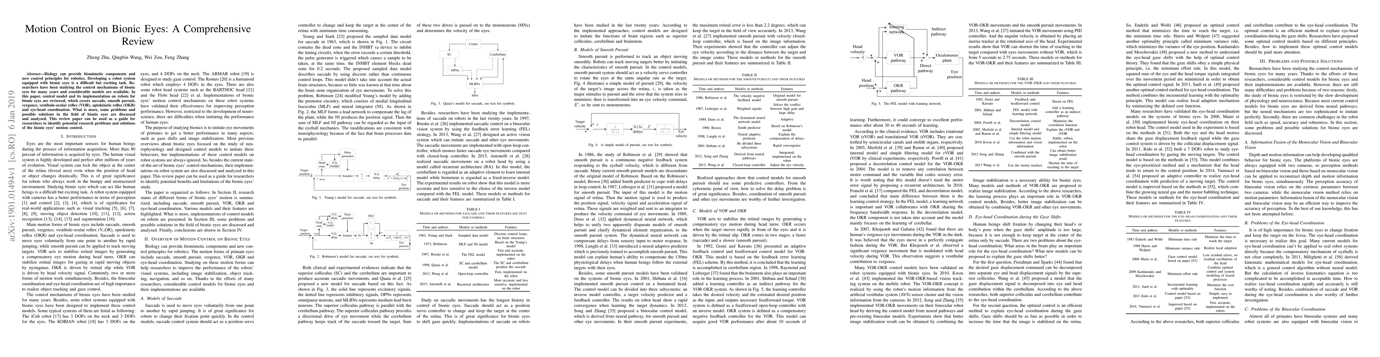 Biology can provide biomimetic components and new control principles for robotics. Developing a robot system equipped with bionic eyes is a difficult but exciting task. Researchers have been studying the control mechanisms of bionic eyes for many years and considerable models are available. In this paper, control model and its implementation on robots for bionic eyes are reviewed, which covers saccade, smooth pursuit, vergence, vestibule-ocular reflex (VOR), optokinetic reflex (OKR) and eye-head coordination. What is more, some problems and possible solutions in the field of bionic eyes are discussed and analyzed. This review paper can be used as a guide for researchers to identify potential research problems and solutions of the bionic eyes' motion control.