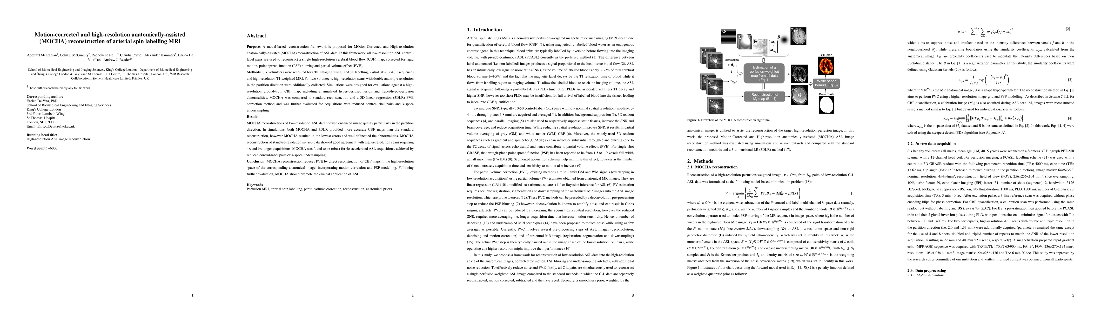 The MOCHA reconstruction framework enhances motion-corrected, high-resolution cerebral blood flow (CBF) maps from arterial spin labeling (ASL) MRI, showing superior accuracy and delineation of abnormalities compared to standard methods. It effectively reduces partial-volume effects and is robust for accelerated acquisitions.