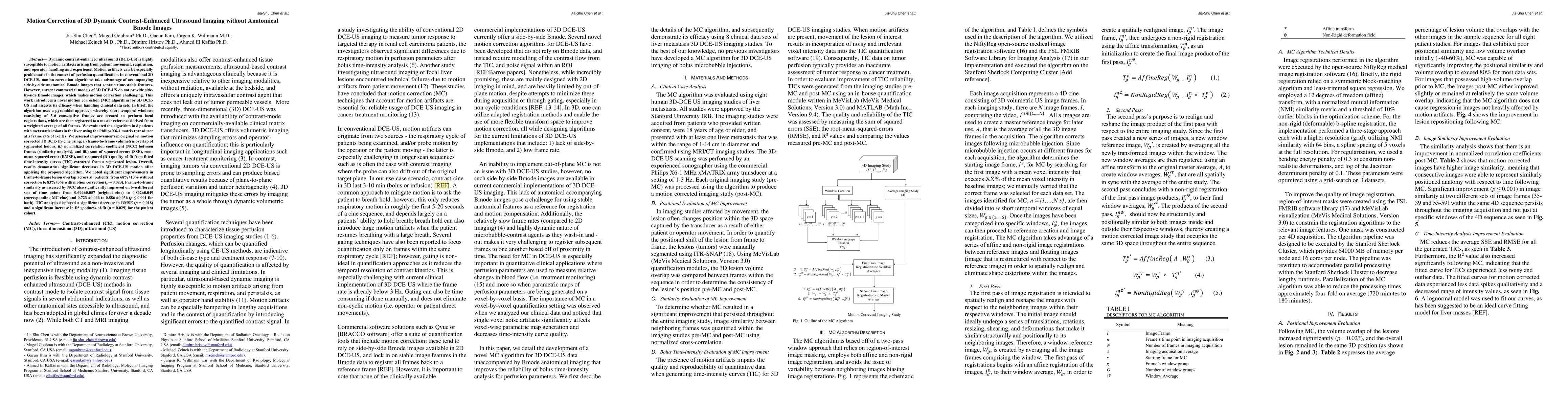 A novel motion correction algorithm for 3D dynamic contrast-enhanced ultrasound imaging improves image quality by correcting motion artifacts in clinical data sets, resulting in increased lesion overlap and accuracy of time-intensity curves.