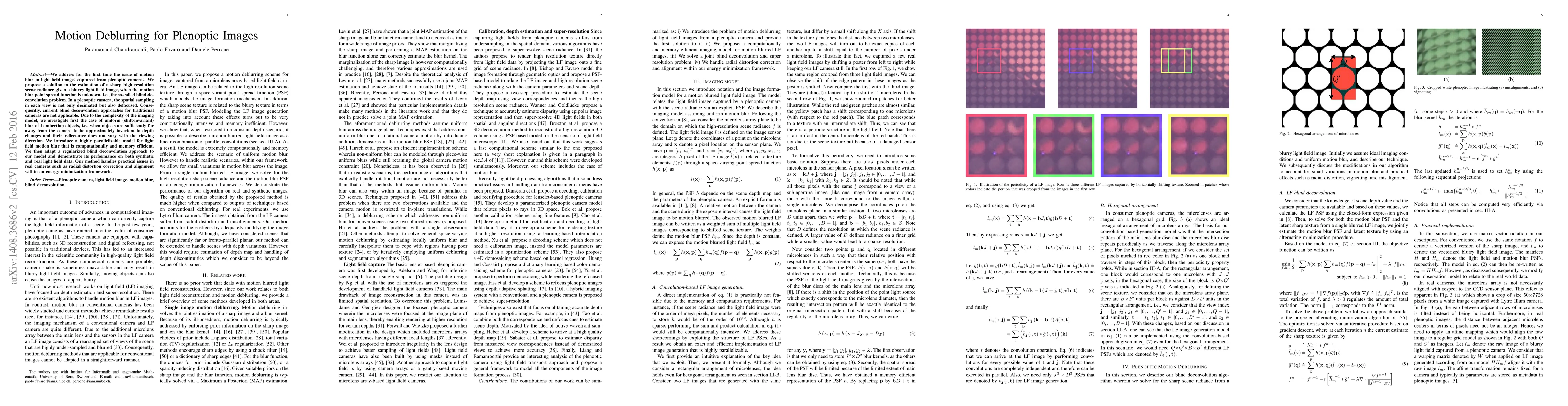 This paper introduces a method to correct motion blur in light field images from plenoptic cameras, addressing a previously unsolved problem. The approach focuses on uniform blur of distant Lambertian objects, presenting a computationally efficient model and adapting blind deconvolution techniques, demonstrated on synthetic and real data, while accounting for camera distortions.