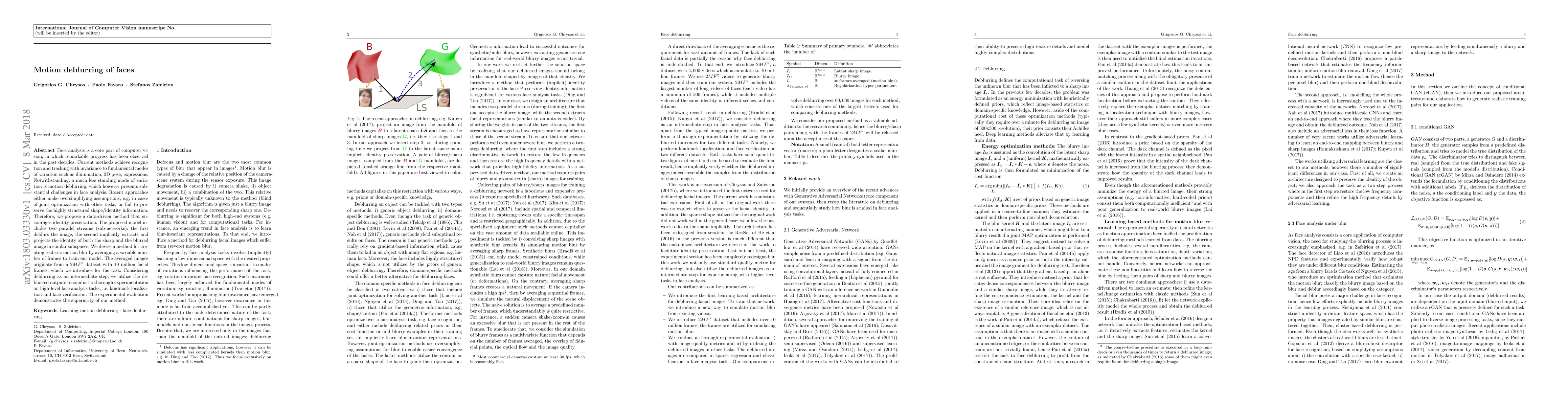 This paper proposes a data-driven method for motion deblurring of faces, featuring two parallel streams to deblur images while preserving identity information. The method is trained on a new dataset and shows improved performance in high-level face analysis tasks like landmark localization and face verification.