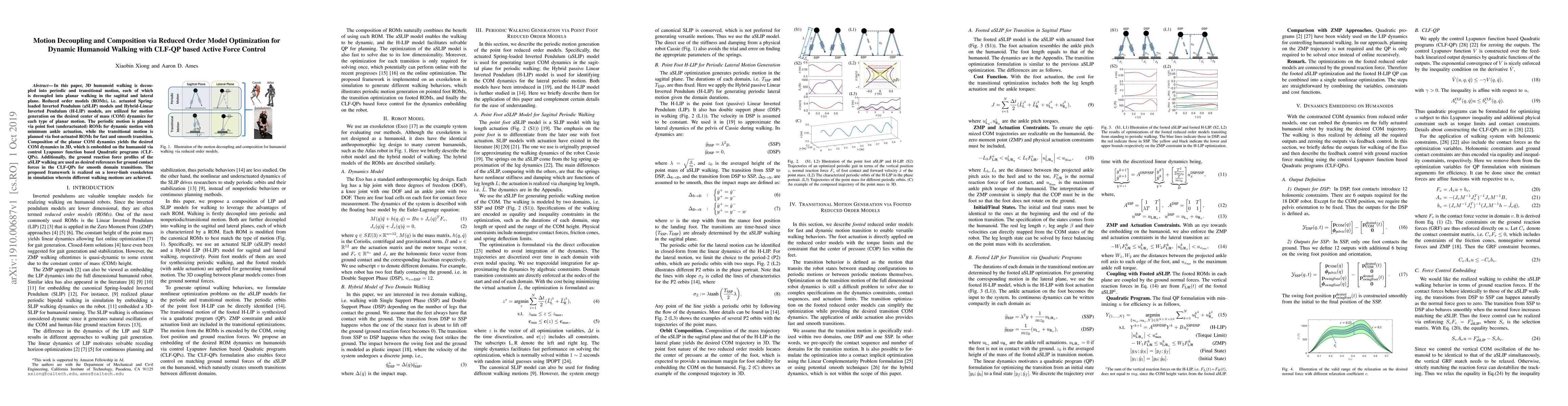 In this paper, 3D humanoid walking is decoupled into periodic and transitional motion, each of which is decoupled into planar walking in the sagittal and lateral plane. Reduced order models (ROMs), i.e. actuated Spring-loaded Inverted Pendulum (aSLIP) models and Hybrid-Linear Inverted Pendulum (H-LIP) models, are utilized for motion generation on the desired center of mass (COM) dynamics for each type of planar motion. The periodic motion is planned via point foot (underactuated) ROMs for dynamic motion with minimum ankle actuation, while the transitional motion is planned via foot-actuated ROMs for fast and smooth transition. Composition of the planar COM dynamics yields the desired COM dynamics in 3D, which is embedded on the humanoid via control Lyapunov function based Quadratic programs (CLF-QPs). Additionally, the ground reaction force profiles of the aSLIP walking are used as desired references for ground contact forces in the CLF-QPs for smooth domain transitions. The proposed framework is realized on a lower-limb exoskeleton in simulation wherein different walking motions are achieved.