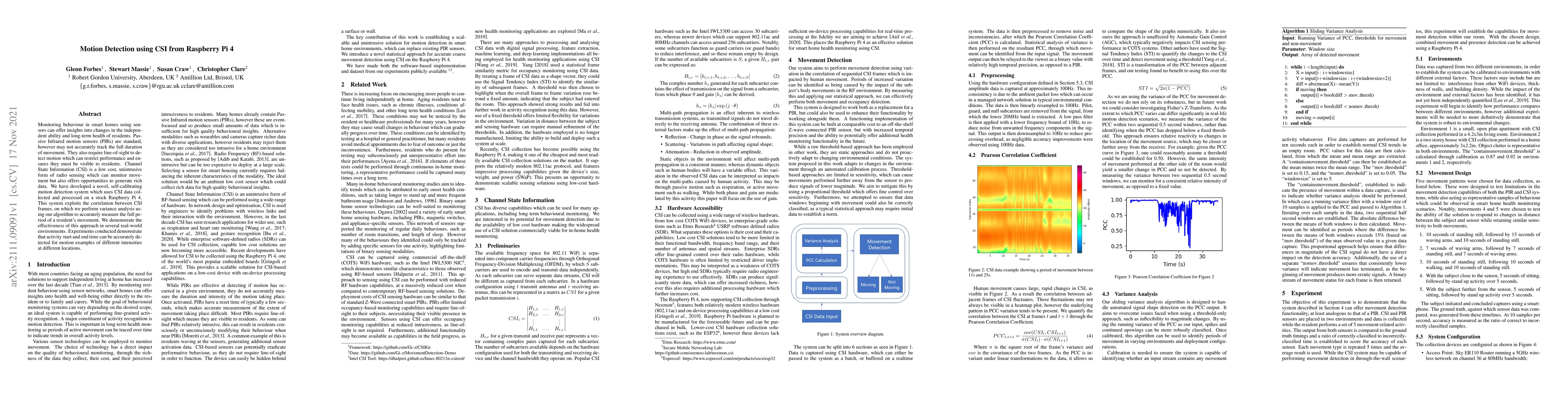 Monitoring behaviour in smart homes using sensors can offer insights into changes in the independent ability and long-term health of residents. Passive Infrared motion sensors (PIRs) are standard, however may not accurately track the full duration of movement. They also require line-of-sight to detect motion which can restrict performance and ensures they must be visible to residents. Channel State Information (CSI) is a low cost, unintrusive form of radio sensing which can monitor movement but also offers opportunities to generate rich data. We have developed a novel, self-calibrating motion detection system which uses CSI data collected and processed on a stock Raspberry Pi 4. This system exploits the correlation between CSI frames, on which we perform variance analysis using our algorithm to accurately measure the full period of a resident's movement. We demonstrate the effectiveness of this approach in several real-world environments. Experiments conducted demonstrate that activity start and end time can be accurately detected for motion examples of different intensities at different locations.
