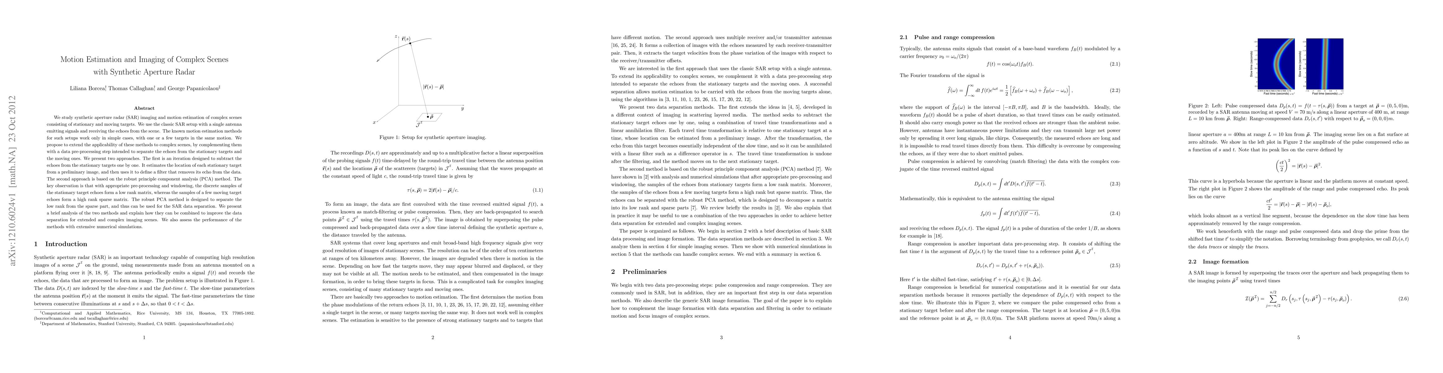This paper proposes advanced methods for synthetic aperture radar (SAR) imaging and motion estimation in complex scenes with both stationary and moving targets. It introduces two approaches: an iterative subtraction method and a robust PCA-based method, which leverages the low-rank nature of stationary echoes and the high-rank sparsity of moving echoes for effective separation.