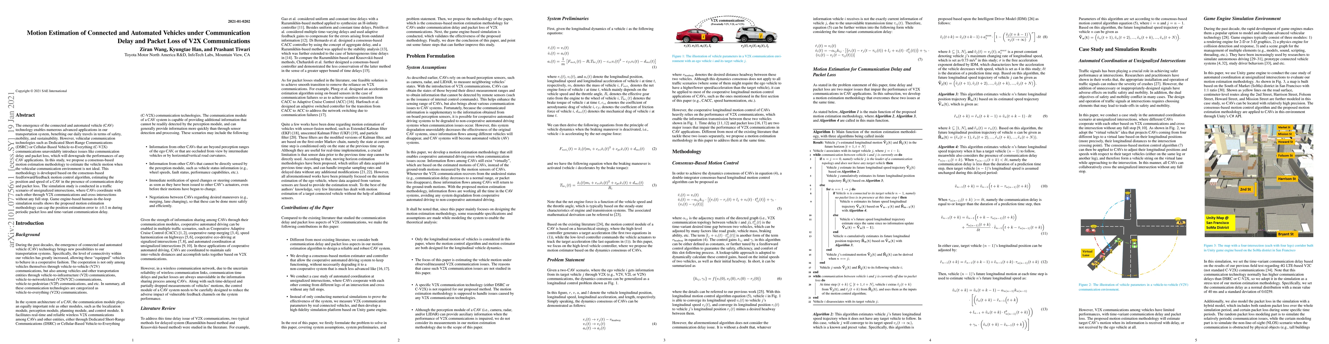 The emergence of the connected and automated vehicle (CAV) technology enables numerous advanced applications in our transportation system, benefiting our daily travels in terms of safety, mobility, and sustainability. However, vehicular communication technologies such as Dedicated Short-Range Communications (DSRC) or Cellular-Based Vehicle-to-Everything (C-V2X) communications unavoidably introduce issues like communication delay and packet loss, which will downgrade the performances of any CAV applications. In this study, we propose a consensus-based motion estimation methodology to estimate the vehicle motion when the vehicular communication environment is not ideal. This methodology is developed based on the consensus-based feedforward/feedback motion control algorithm, estimating the position and speed of a CAV in the presence of communication delay and packet loss. The simulation study is conducted in a traffic scenario of unsignalized intersections, where CAVs coordinate with each other through V2X communications and cross intersections without any full stop. Game engine-based human-in-the-loop simulation results shows the proposed motion estimation methodology can cap the position estimation error to 0.5 m during periodic packet loss and time-variant communication delay.