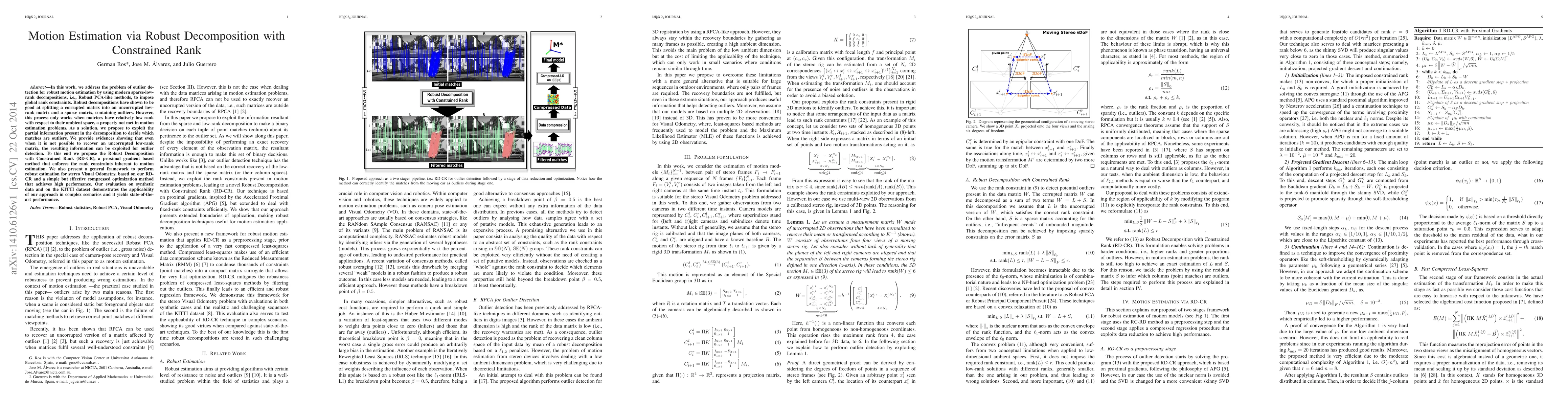 In this work, we address the problem of outlier detection for robust motion estimation by using modern sparse-low-rank decompositions, i.e., Robust PCA-like methods, to impose global rank constraints. Robust decompositions have shown to be good at splitting a corrupted matrix into an uncorrupted low-rank matrix and a sparse matrix, containing outliers. However, this process only works when matrices have relatively low rank with respect to their ambient space, a property not met in motion estimation problems. As a solution, we propose to exploit the partial information present in the decomposition to decide which matches are outliers. We provide evidences showing that even when it is not possible to recover an uncorrupted low-rank matrix, the resulting information can be exploited for outlier detection. To this end we propose the Robust Decomposition with Constrained Rank (RD-CR), a proximal gradient based method that enforces the rank constraints inherent to motion estimation. We also present a general framework to perform robust estimation for stereo Visual Odometry, based on our RD-CR and a simple but effective compressed optimization method that achieves high performance. Our evaluation on synthetic data and on the KITTI dataset demonstrates the applicability of our approach in complex scenarios and it yields state-of-the-art performance.