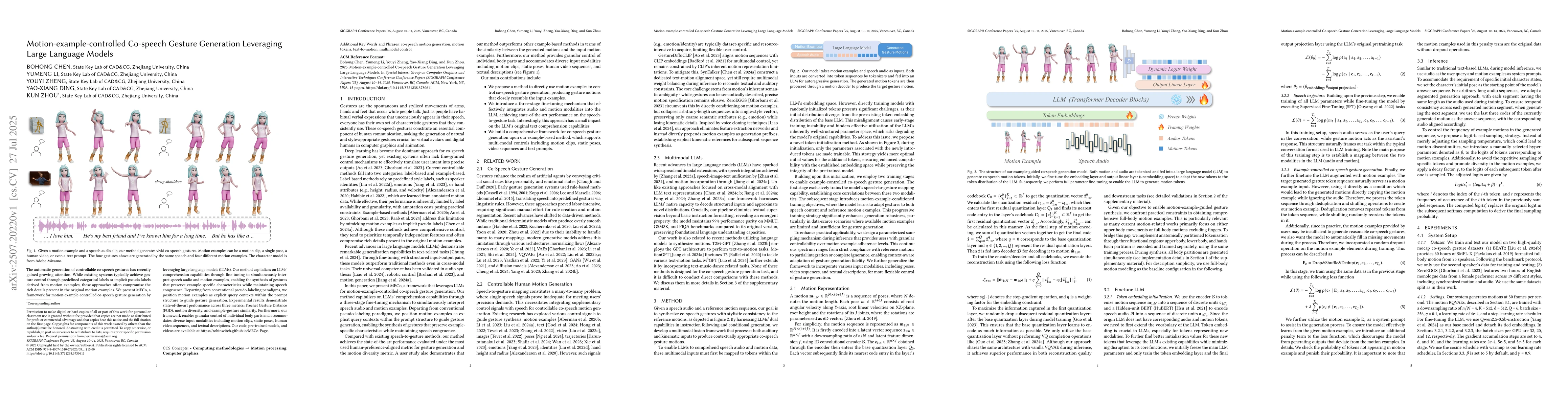 The automatic generation of controllable co-speech gestures has recently gained growing attention. While existing systems typically achieve gesture control through predefined categorical labels or implicit pseudo-labels derived from motion examples, these approaches often compromise the rich details present in the original motion examples. We present MECo, a framework for motion-example-controlled co-speech gesture generation by leveraging large language models (LLMs). Our method capitalizes on LLMs' comprehension capabilities through fine-tuning to simultaneously interpret speech audio and motion examples, enabling the synthesis of gestures that preserve example-specific characteristics while maintaining speech congruence. Departing from conventional pseudo-labeling paradigms, we position motion examples as explicit query contexts within the prompt structure to guide gesture generation. Experimental results demonstrate state-of-the-art performance across three metrics: Fr\'echet Gesture Distance (FGD), motion diversity, and example-gesture similarity. Furthermore, our framework enables granular control of individual body parts and accommodates diverse input modalities including motion clips, static poses, human video sequences, and textual descriptions. Our code, pre-trained models, and videos are available at https://robinwitch.github.io/MECo-Page.