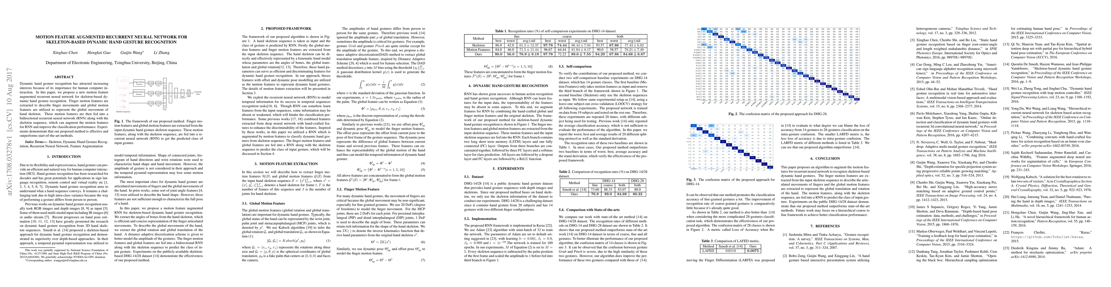 This paper proposes a motion feature augmented recurrent neural network for skeleton-based dynamic hand gesture recognition, combining finger motion and global motion features to enhance a bidirectional RNN, which significantly improves classification performance over existing methods.