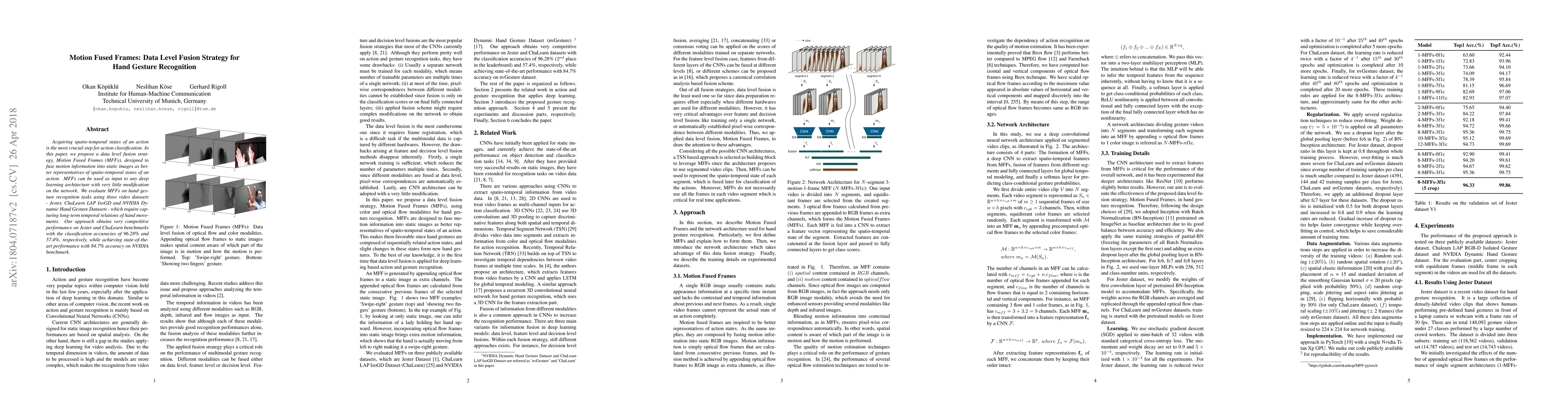 This paper introduces Motion Fused Frames (MFFs), a data level fusion strategy to enhance hand gesture recognition by integrating motion information into static images. The proposed method achieves competitive performance on multiple datasets, demonstrating state-of-the-art results on the NVIDIA Dynamic Hand Gesture Dataset.