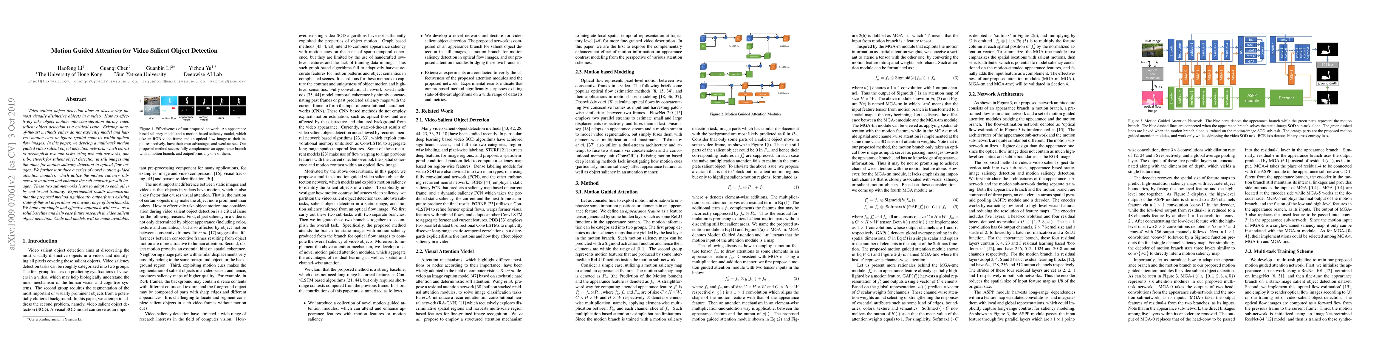 This paper proposes a multi-task network for video salient object detection that incorporates motion cues through two sub-networks: one for still image salient object detection and another for motion saliency detection in optical flow images, enhanced by novel motion guided attention modules. The method outperforms existing algorithms and aims to set a new baseline for future research.