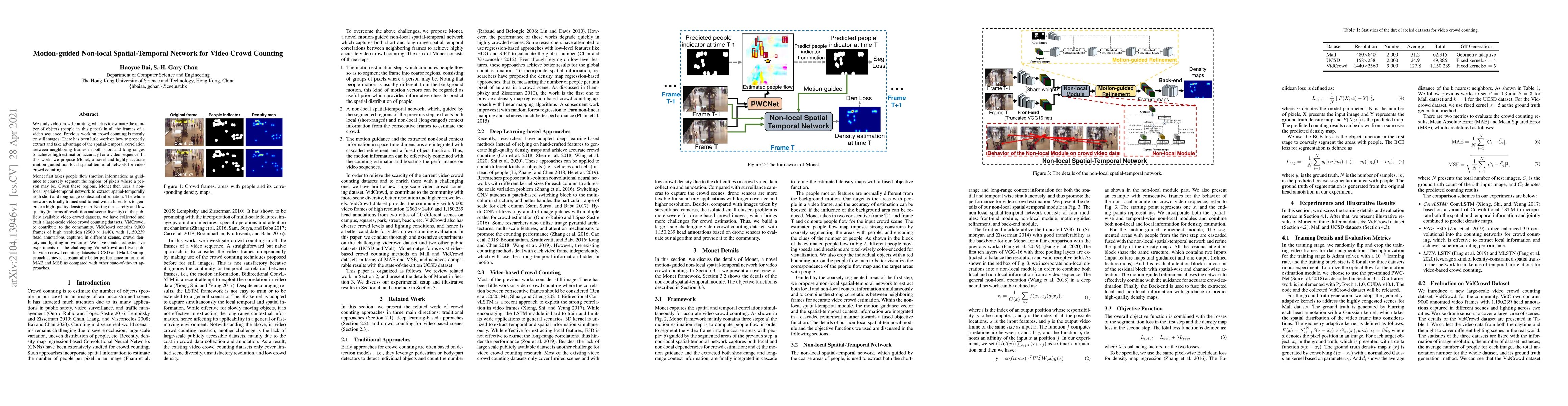 This paper proposes Monet, a motion-guided non-local spatial-temporal network for accurate video crowd counting, leveraging both short and long-range spatial-temporal correlations. The authors also introduce VidCrowd, a large-scale video dataset, and demonstrate Monet's superior performance over existing methods on multiple datasets.