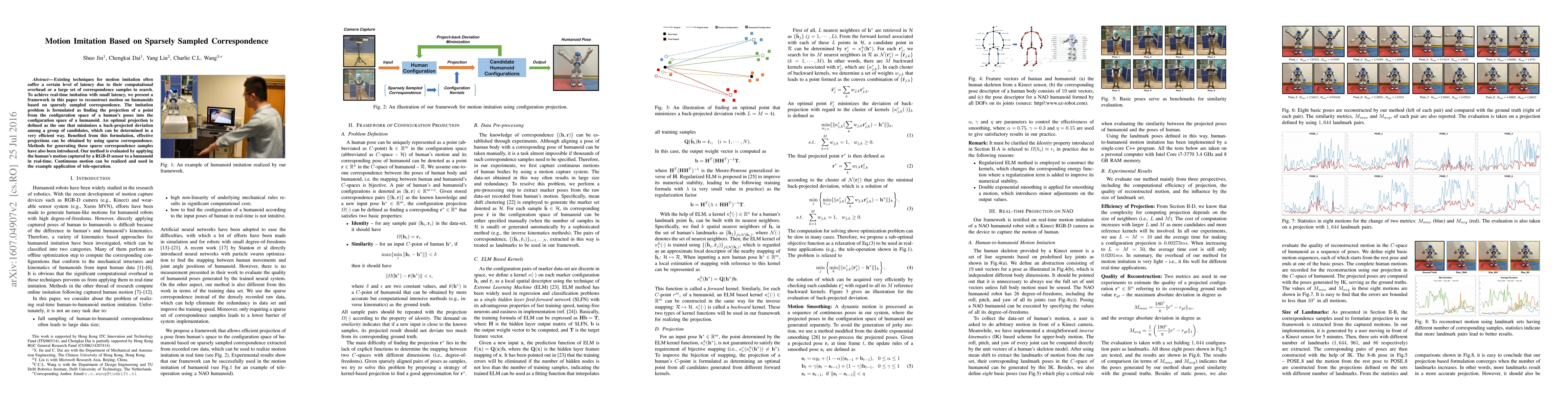 Existing techniques for motion imitation often suffer a certain level of latency due to their computational overhead or a large set of correspondence samples to search. To achieve real-time imitation with small latency, we present a framework in this paper to reconstruct motion on humanoids based on sparsely sampled correspondence. The imitation problem is formulated as finding the projection of a point from the configuration space of a human's poses into the configuration space of a humanoid. An optimal projection is defined as the one that minimizes a back-projected deviation among a group of candidates, which can be determined in a very efficient way. Benefited from this formulation, effective projections can be obtained by using sparse correspondence. Methods for generating these sparse correspondence samples have also been introduced. Our method is evaluated by applying the human's motion captured by a RGB-D sensor to a humanoid in real-time. Continuous motion can be realized and used in the example application of tele-operation.