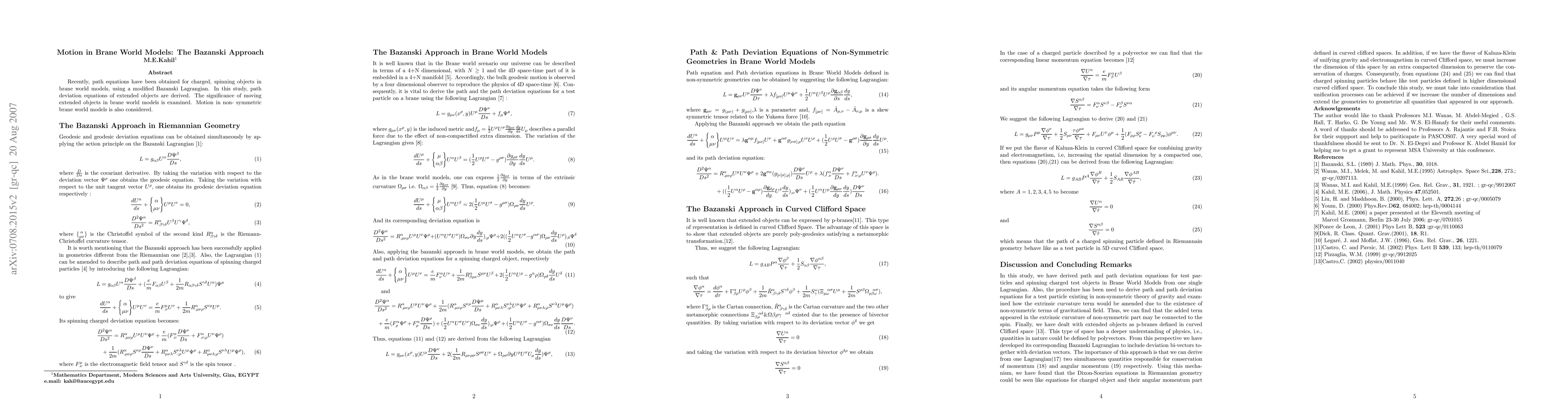 This paper derives path deviation equations for charged, spinning extended objects in brane world models using a modified Bazanski Lagrangian, focusing on the implications of motion in both symmetric and non-symmetric brane world scenarios. The study highlights the significance of moving extended objects within these theoretical frameworks.