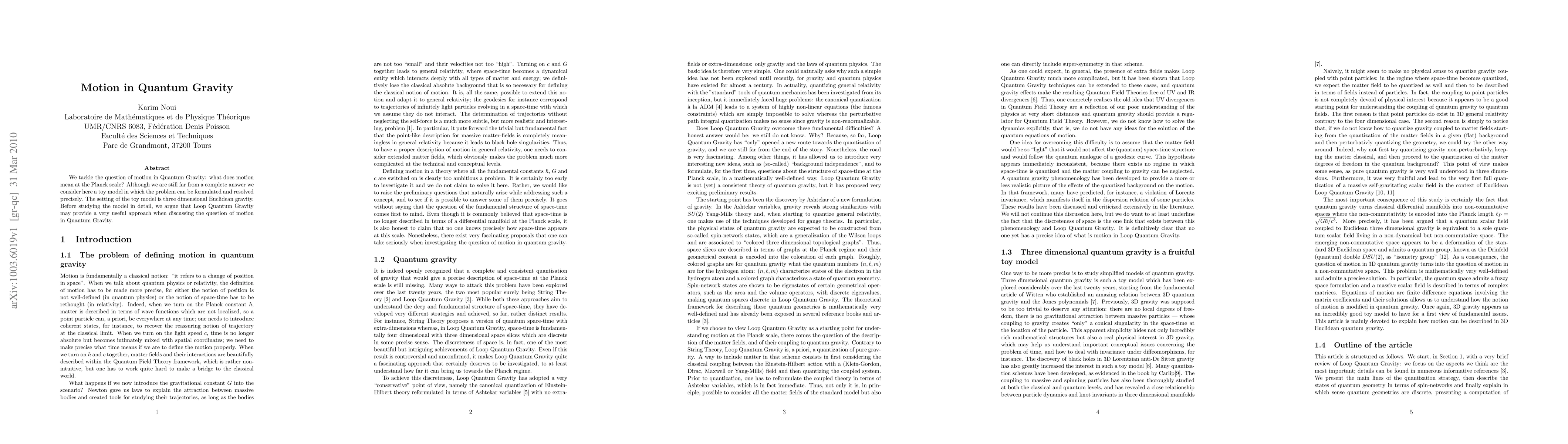 This paper explores the concept of motion in the context of Quantum Gravity, particularly at the Planck scale, using a three-dimensional Euclidean gravity toy model. The study suggests that Loop Quantum Gravity could be a valuable approach to addressing the fundamental question of motion in Quantum Gravity.
