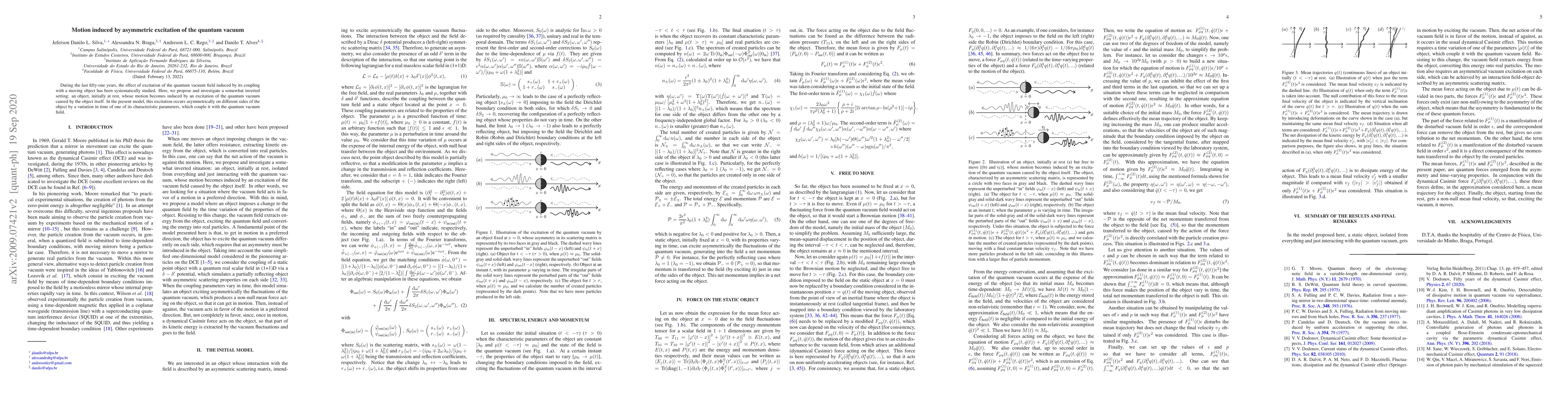 During the last fifty-one years, the effect of excitation of the quantum vacuum field induced by its coupling with a moving object has been systematically studied. Here, we propose and investigate a somewhat inverted setting: an object, initially at rest, whose motion becomes induced by an excitation of the quantum vacuum caused by the object itself. In the present model, this excitation occurs asymmetrically on different sides of the object by a variation in time of one of its characteristic parameters, which couple it with the quantum vacuum field.
