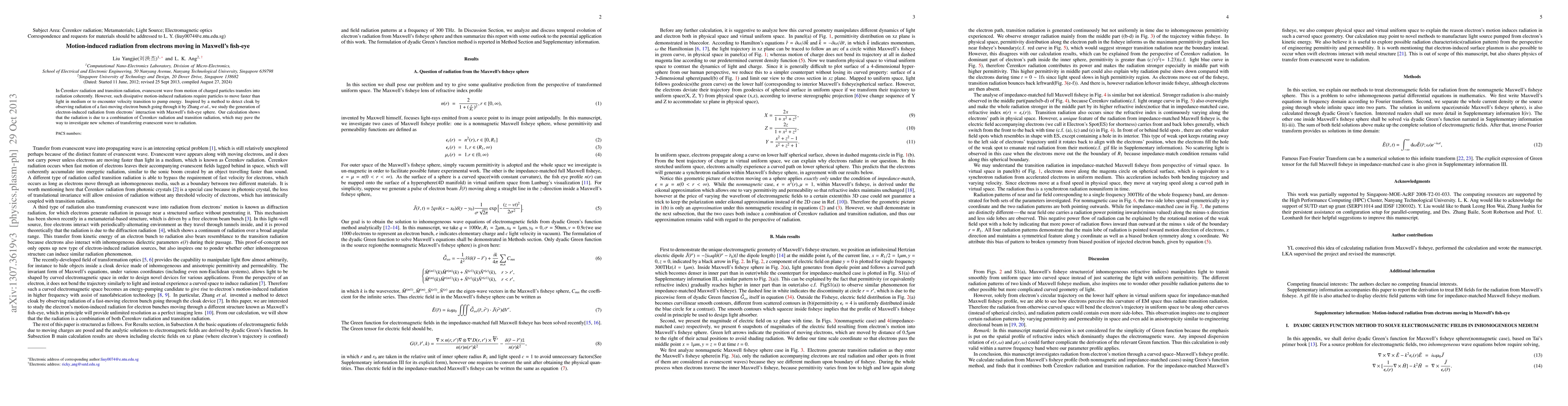 Researchers discovered motion-induced radiation from electrons moving in a Maxwell's fish-eye sphere, which may enable new schemes for transferring evanescent waves to radiation. This finding combines Cerenkov and transition radiation, offering potential applications in cloaking technology.