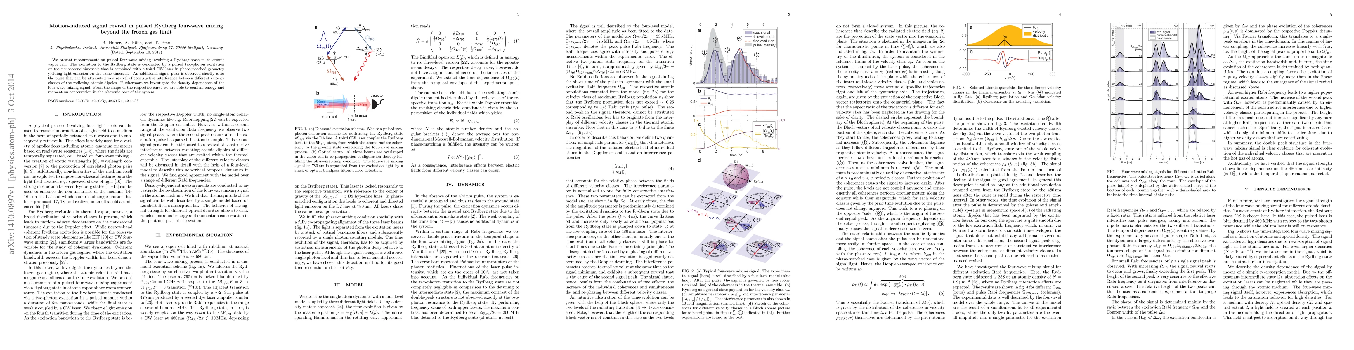 This paper reports on pulsed four-wave mixing in Rydberg states, revealing a motion-induced signal revival due to interference between different atomic velocity classes. The study confirms energy and momentum conservation in the photonic system through density-dependent signal analysis.