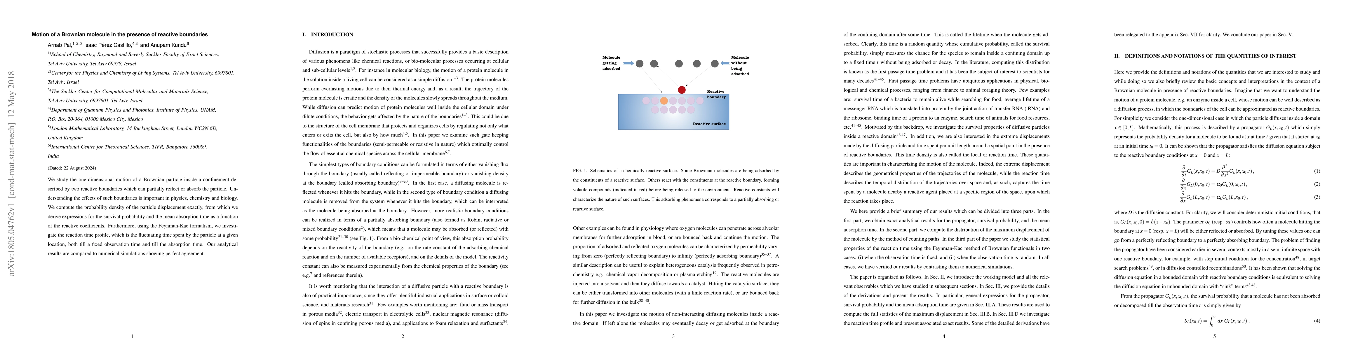 Researchers studied a Brownian particle's motion in a confined space with reactive boundaries, finding expressions for survival probability and absorption time that accurately predicted results from numerical simulations.