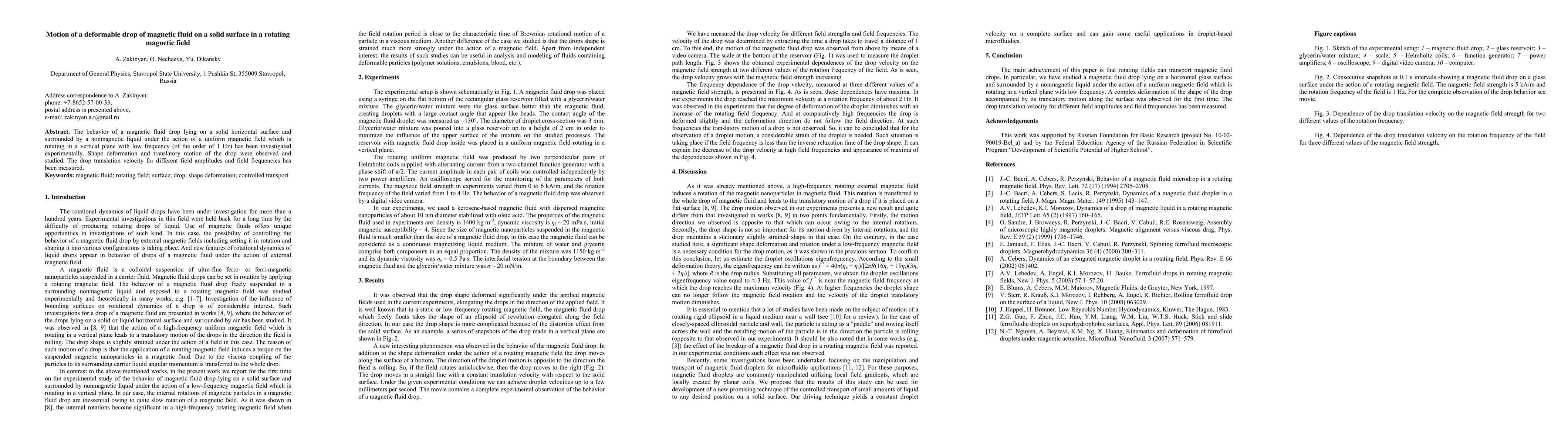 This study investigates the motion of a deformable magnetic fluid drop on a solid surface under a rotating magnetic field, observing its shape deformation and translatory motion. Experimental results reveal the drop's translation velocity variations with different magnetic field amplitudes and frequencies.