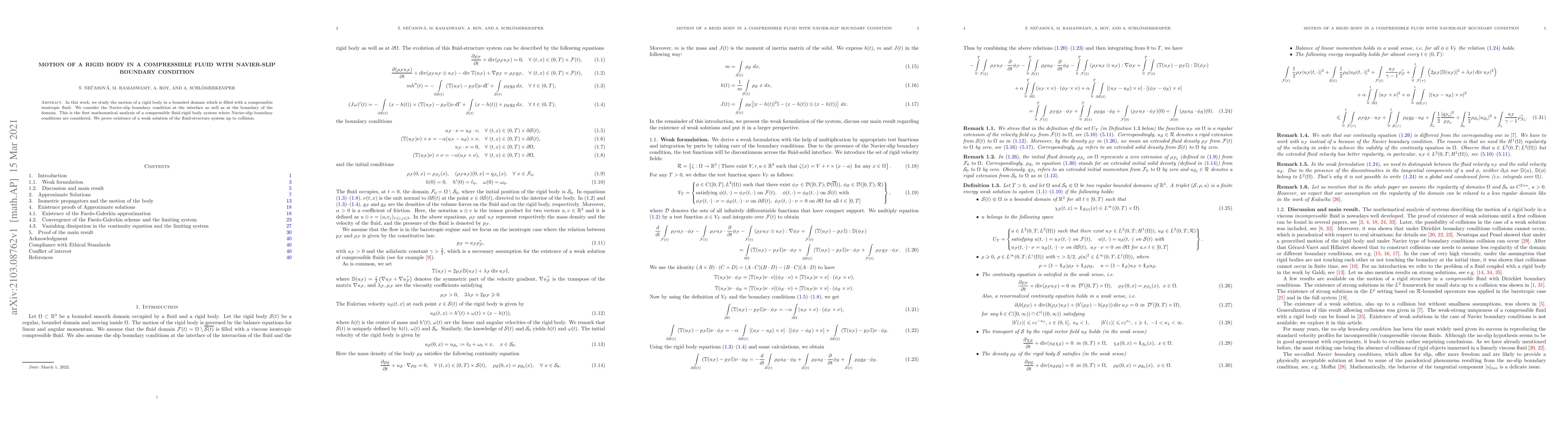 This paper investigates the motion of a rigid body in a compressible isentropic fluid, employing Navier-slip boundary conditions. It establishes the existence of a weak solution for the fluid-structure interaction system up to the point of potential collision.