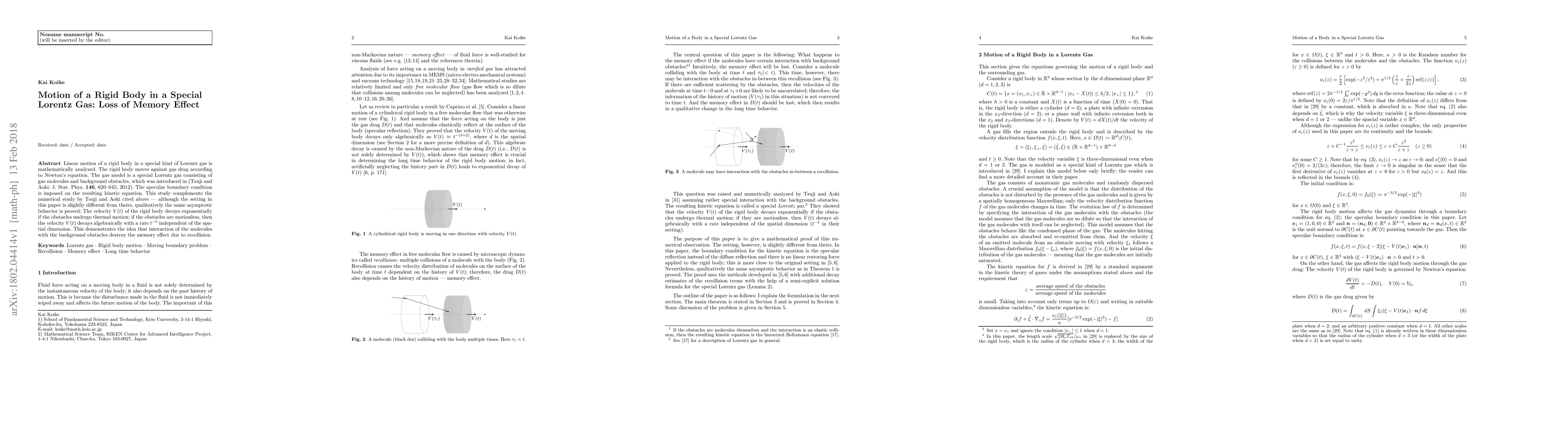 This paper mathematically analyzes the motion of a rigid body in a special Lorentz gas, showing that the velocity decays exponentially when obstacles are in thermal motion and decays algebraically when they are fixed, illustrating the loss of memory effect due to molecular interactions with obstacles.