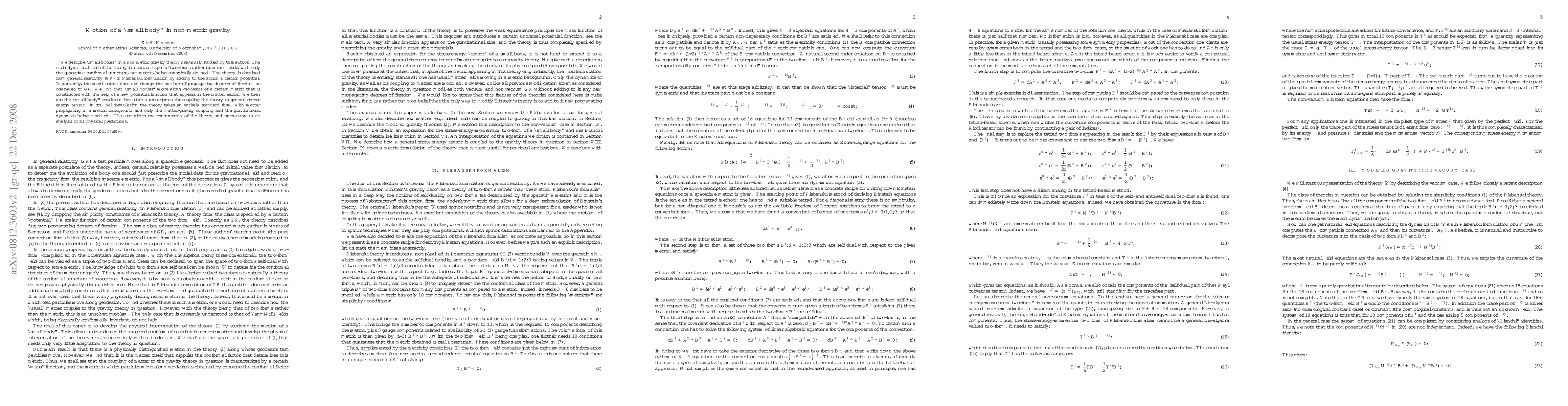 A new gravity theory modifies general relativity by adding a potential function, resulting in geodesics with a previously unknown metric that describes the motion of 'small bodies' in the new framework. The modified theory can be coupled to standard stress-energy tensors and provides a new understanding of physical predictions.
