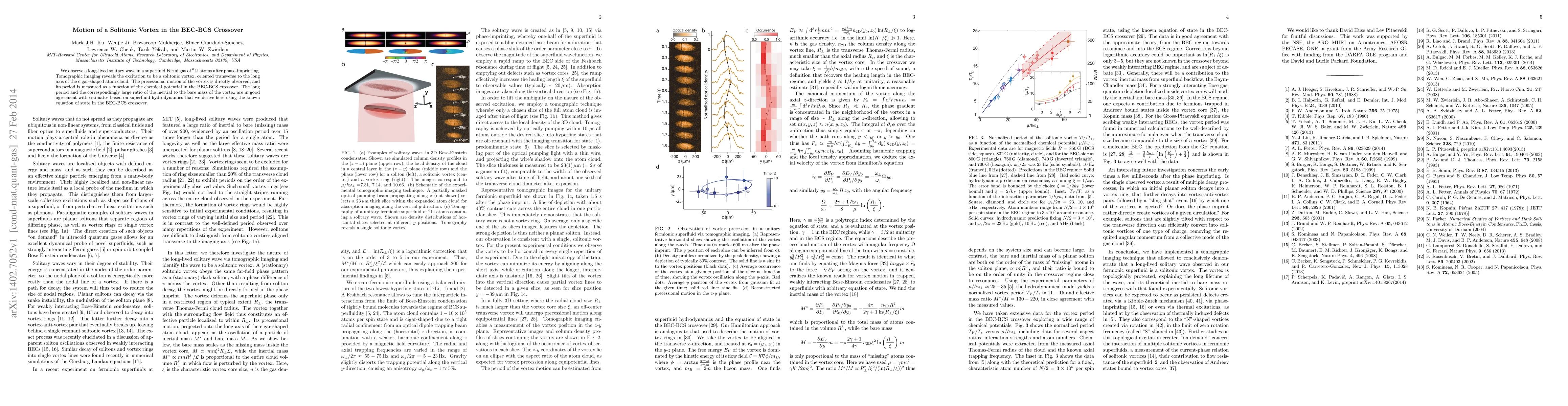 We observe a long-lived solitary wave in a superfluid Fermi gas of $^6$Li atoms after phase-imprinting. Tomographic imaging reveals the excitation to be a solitonic vortex, oriented transverse to the long axis of the cigar-shaped atom cloud. The precessional motion of the vortex is directly observed, and its period is measured as a function of the chemical potential in the BEC-BCS crossover. The long period and the correspondingly large ratio of the inertial to the bare mass of the vortex are in good agreement with estimates based on superfluid hydrodynamics that we derive here using the known equation of state in the BEC-BCS crossover.