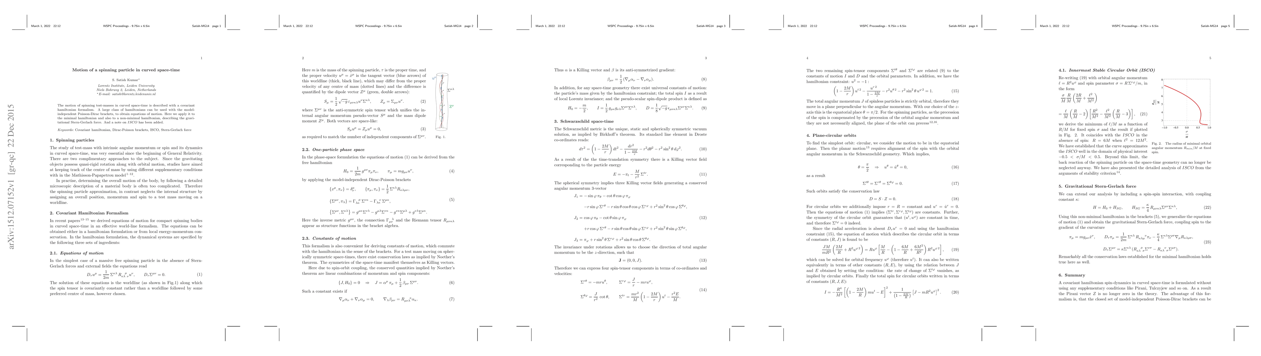 The motion of spinning test-masses in curved space-time is described with a covariant hamiltonian formalism. A large class of hamiltonians can be used with the model- independent Poisson-Dirac brackets, to obtain equations of motion. Here we apply it to the minimal hamiltonian and also to a non-minimal hamiltonian, describing the gravi- tational Stern-Gerlach force. And a note on ISCO has been added.