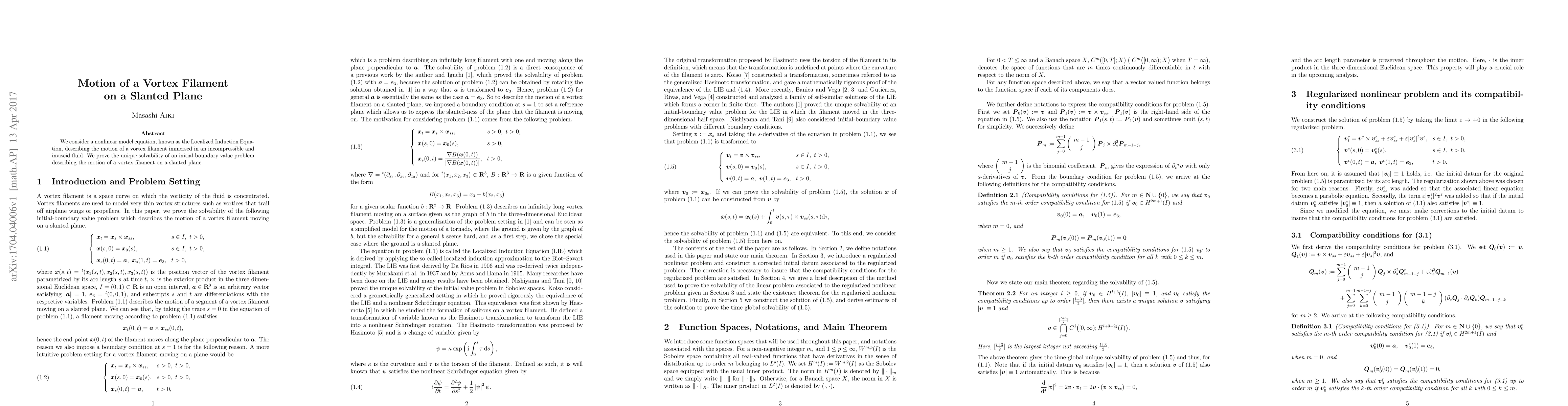 This paper investigates the motion of a vortex filament using the Localized Induction Equation in an incompressible fluid, proving the unique solvability of the initial-boundary value problem for a vortex filament on a slanted plane.