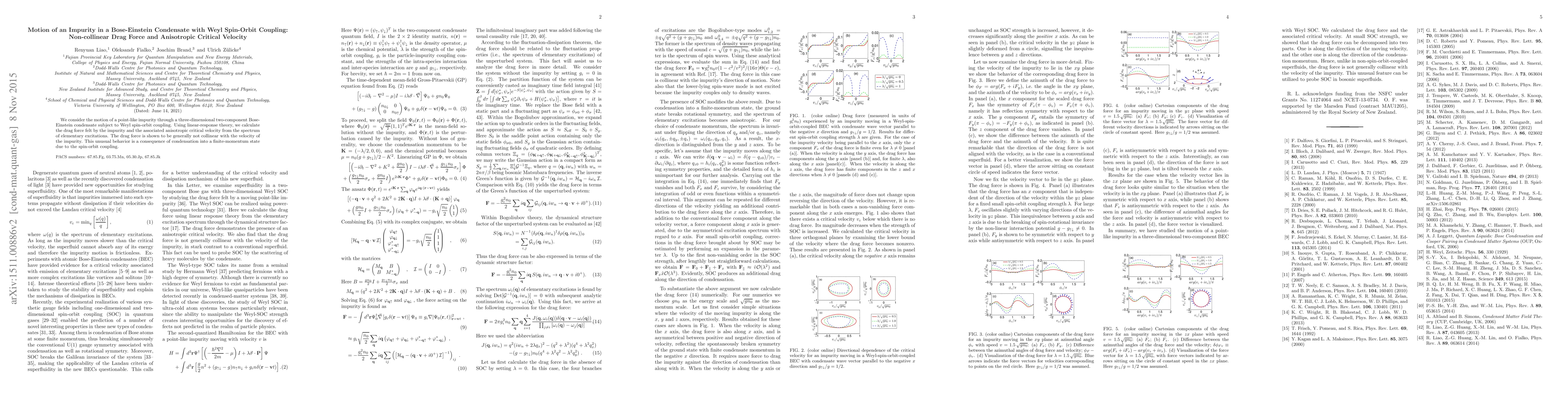 This paper investigates the motion of an impurity in a Bose-Einstein condensate with Weyl spin-orbit coupling, revealing a non-collinear drag force and anisotropic critical velocity. The study uses linear-response theory to demonstrate that the drag force deviates from the impurity's velocity direction due to finite-momentum state condensation.