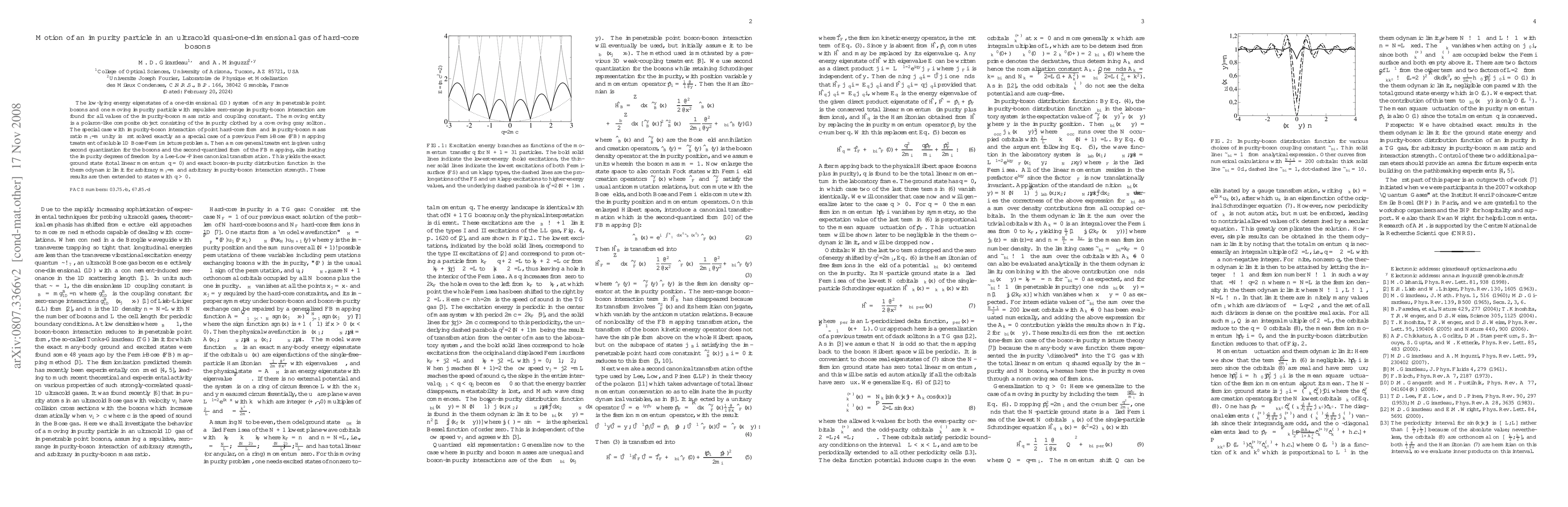 This paper investigates the motion of an impurity particle in a one-dimensional gas of hard-core bosons, deriving exact solutions for various impurity-boson mass ratios and interaction strengths. It employs a Fermi-Bose mapping and Lee-Low-Pines transformation to solve the problem, revealing a polaron-like composite structure formed by the impurity and a co-moving gray soliton.