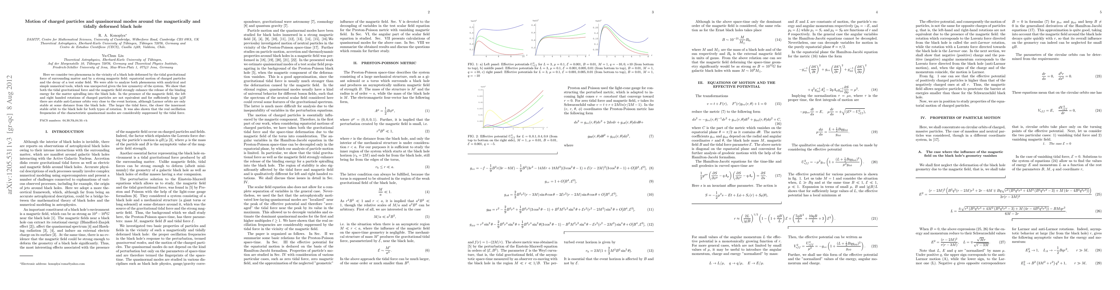 Here we consider two phenomena in the vicinity of a black hole deformed by the tidal gravitational force of surrounding matter and by a strong magnetic field: equatorial motion of charged particles and the decay of a test scalar field. We were able to analyze both phenomena with analytical and simple numerical tools, which was unexpected given the low symmetry of the system. We show that both the tidal gravitational force and the magnetic field strongly enhance the release of the binding energy for the matter spiralling into the black hole. In the presence of the magnetic field, the left and right handed rotations of charged particles are not equivalent and for sufficiently large $|q| B$ there are stable anti-Larmor orbits very close to the event horizon, although Larmor orbits are only stable at some distance from the black hole. The larger the tidal force, the closer the innermost stable orbit to the black hole for both types of rotation. It was also shown that the real oscillation frequencies of the characteristic quasinormal modes are considerably suppressed by the tidal force.