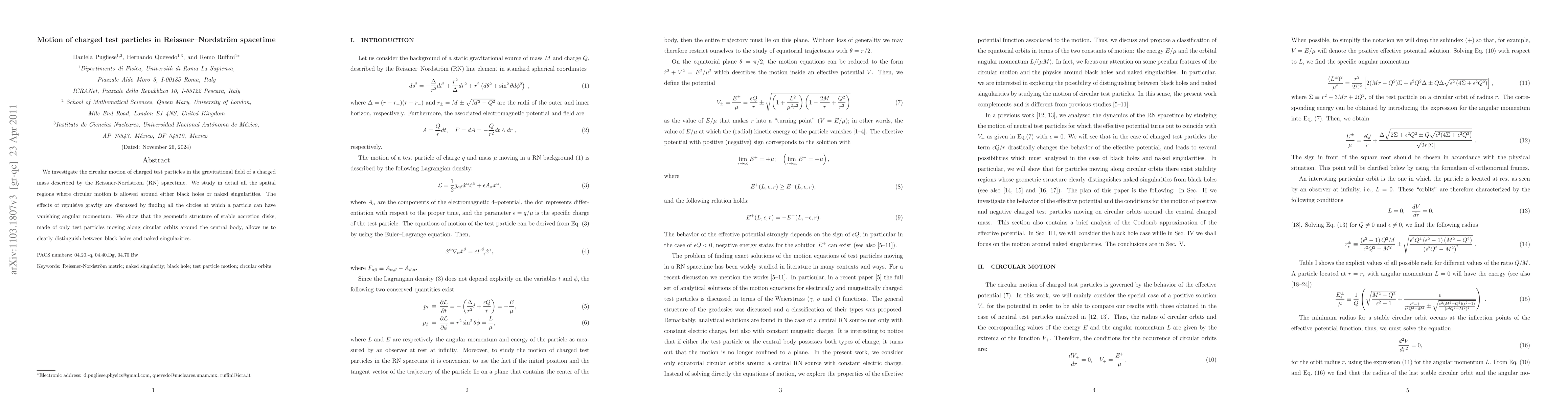 This paper examines the circular motion of charged test particles in the Reissner-Nordström spacetime, identifying regions where such motion is possible around charged black holes or naked singularities. It highlights the unique geometric structure of stable accretion disks that can distinguish between these two types of central objects.