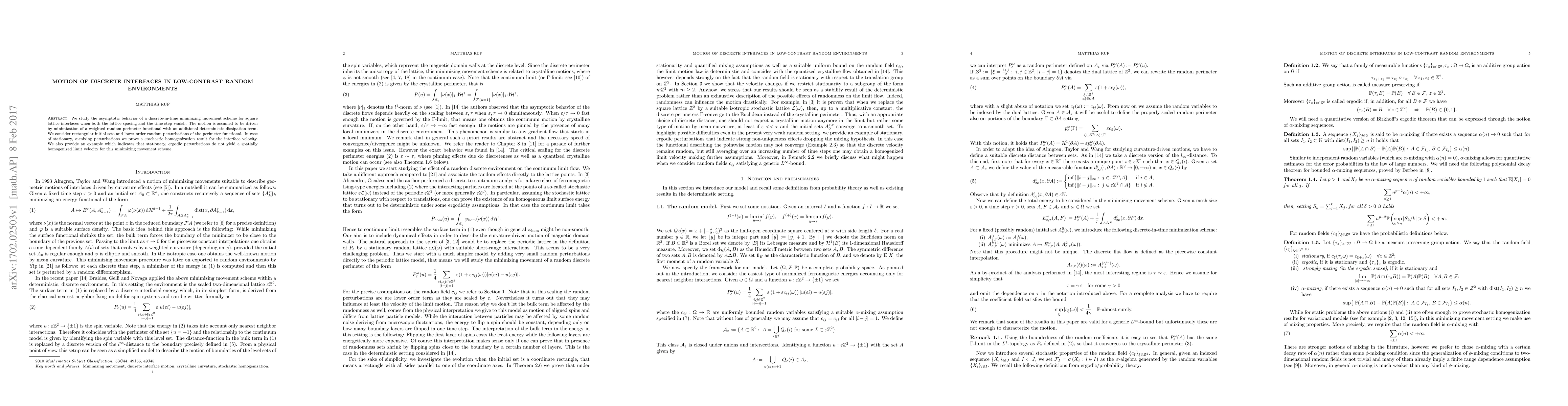 We study the asymptotic behavior of a discrete-in-time minimizing movement scheme for square lattice interfaces when both the lattice spacing and the time step vanish. The motion is assumed to be driven by minimization of a weighted random perimeter functional with an additional deterministic dissipation term. We consider rectangular initial sets and lower order random perturbations of the perimeter functional. In case of stationary, $\alpha$-mixing perturbations we prove a stochastic homogenization result for the interface velocity. We also provide an example which indicates that stationary, ergodic perturbations do not yield a spatially homogenized limit velocity for this minimizing movement scheme.