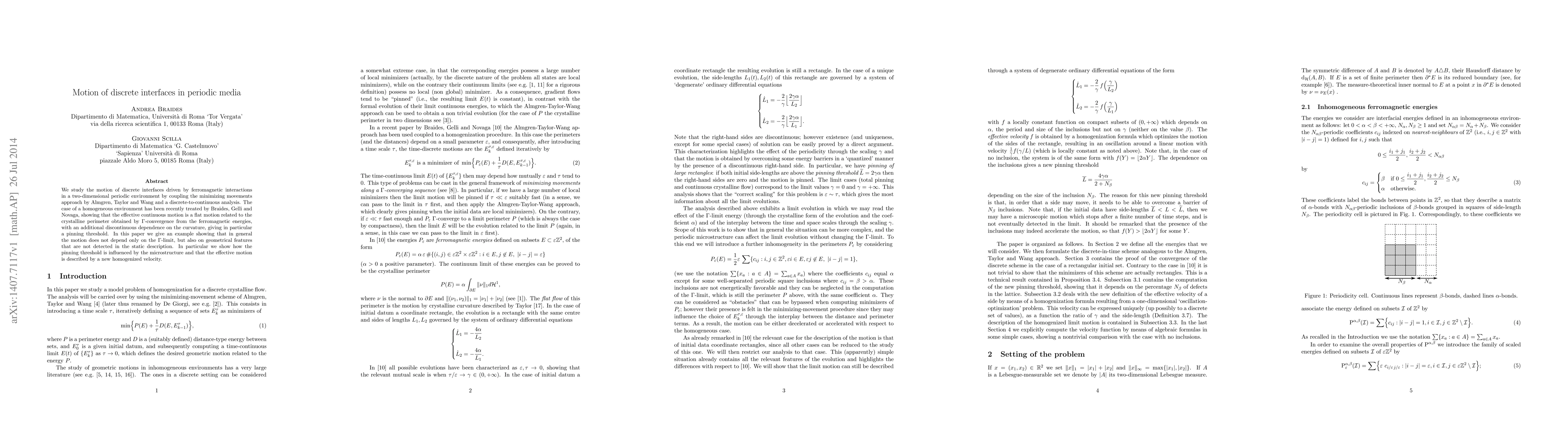 We study the motion of discrete interfaces driven by ferromagnetic interactions in a two-dimensional periodic environment by coupling the minimizing movements approach by Almgren, Taylor and Wang and a discrete-to-continuous analysis. The case of a homogeneous environment has been recently treated by Braides, Gelli and Novaga, showing that the effective continuous motion is a flat motion related to the crystalline perimeter obtained by $\Gamma$-convergence from the ferromagnetic energies, with an additional discontinuous dependence on the curvature, giving in particular a pinning threshold. In this paper we give an example showing that in general the motion does not depend only on the $\Gamma$-limit, but also on geometrical features that are not detected in the static description. In particular we show how the pinning threshold is influenced by the microstructure and that the effective motion is described by a new homogenized velocity.