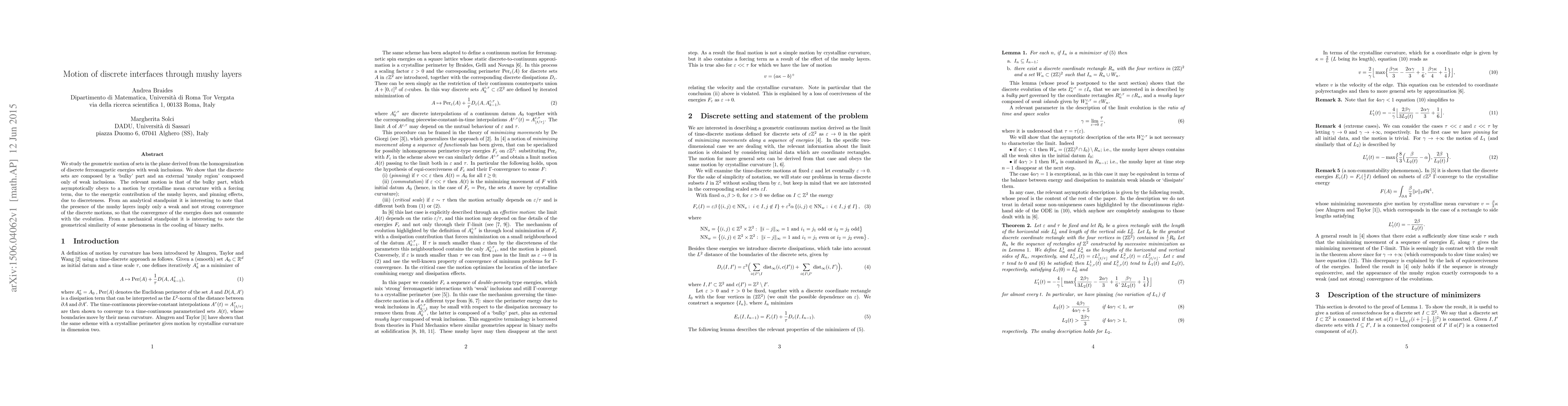 We study the geometric motion of sets in the plane derived from the homogenization of discrete ferromagnetic energies with weak inclusions. We show that the discrete sets are composed by a `bulky' part and an external `mushy region' composed only of weak inclusions. The relevant motion is that of the bulky part, which asymptotically obeys to a motion by crystalline mean curvature with a forcing term, due to the energetic contribution of the mushy layers, and pinning effects, due to discreteness. From an analytical standpoint it is interesting to note that the presence of the mushy layers imply only a weak and not strong convergence of the discrete motions, so that the convergence of the energies does not commute with the evolution. From a mechanical standpoint it is interesting to note the geometrical similarity of some phenomena in the cooling of binary melts.