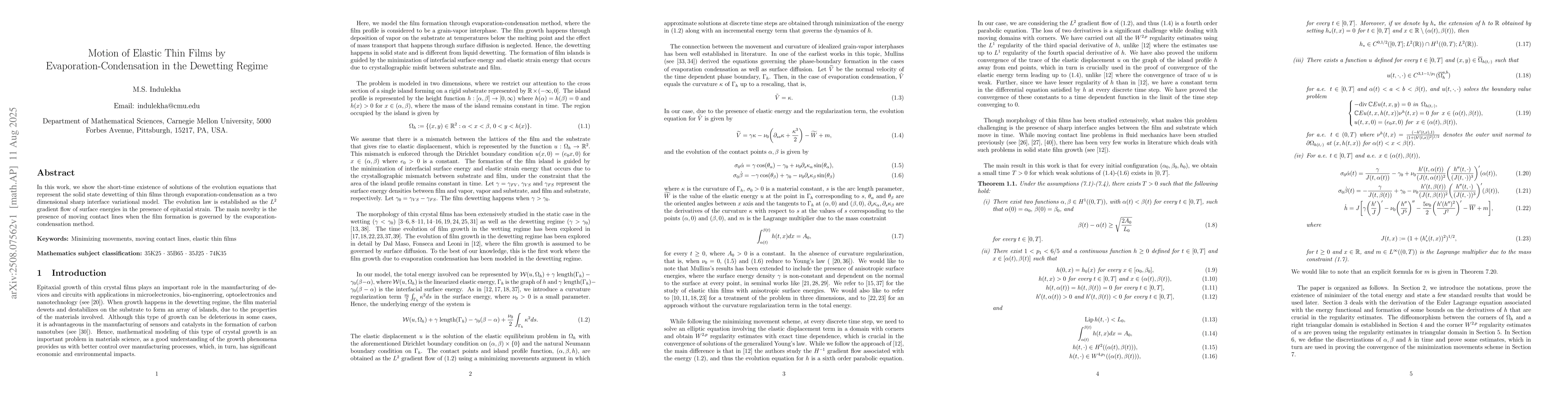 In this work, we show the short-time existence of solutions of the evolution equations that represent the solid state dewetting of thin films through evaporation-condensation as a two dimensional sharp interface variational model. The evolution law is established as the $L^2$ gradient flow of surface energies in the presence of epitaxial strain. The main novelty is the presence of moving contact lines when the film formation is governed by the evaporation-condensation method.