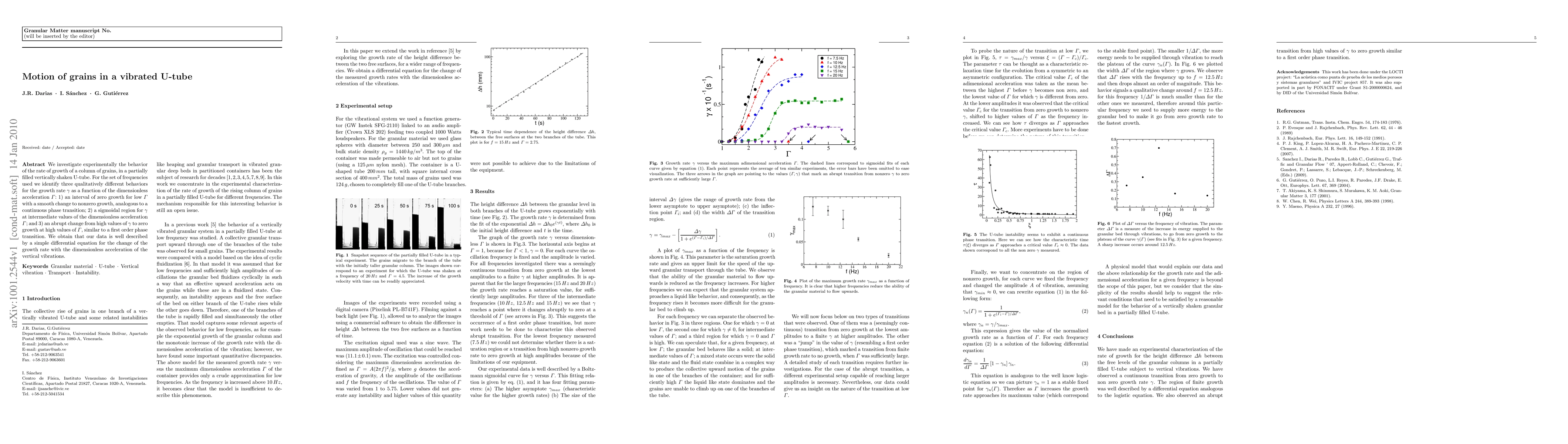 We investigate experimentally the behavior of the rate of growth of a column of grains, in a partially filled vertically shaken U-tube. For the set of frequencies used we identify three qualitatively different behaviors for the growth rate $\gamma$ as a function of the dimensionless acceleration $\Gamma$: 1) an interval of zero growth for low $\Gamma$ with a smooth change to nonzero growth, analogous to a continuous phase transition; 2) a sigmoidal region for $\gamma$ at intermediate values of the dimensionless acceleration $\Gamma$; and 3) an abrupt change from high values of $\gamma$ to zero growth at high values of $\Gamma$, similar to a first order phase transition. We obtain that our data is well described by a simple differential equation for the change of the growth rate with the dimensionless acceleration of the vertical vibrations.