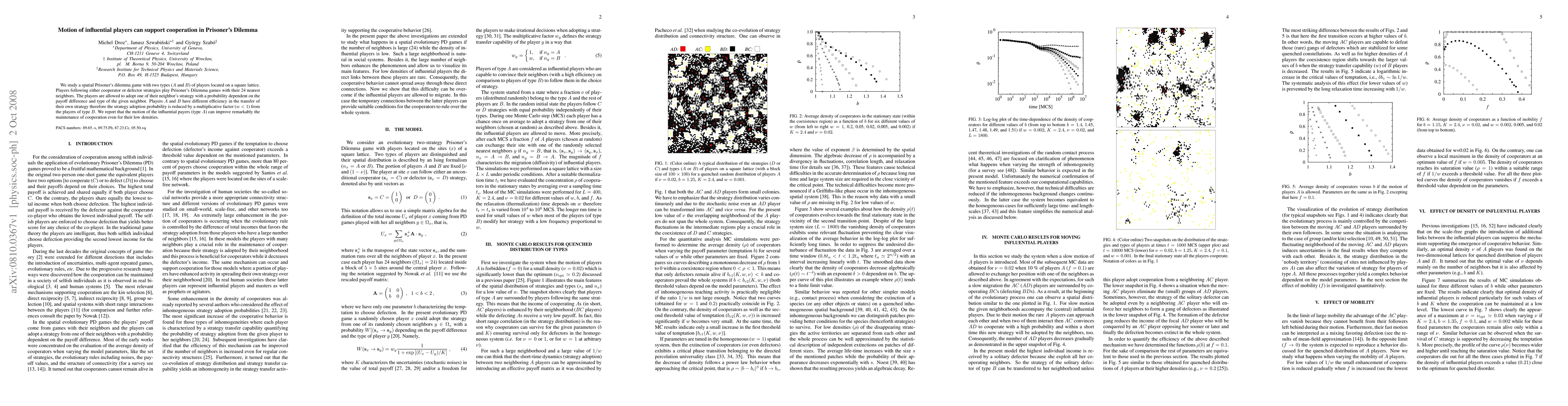 We study a spatial Prisoner's dilemma game with two types (A and B) of players located on a square lattice. Players following either cooperator or defector strategies play Prisoner's Dilemma games with their 24 nearest neighbors. The players are allowed to adopt one of their neighbor's strategy with a probability dependent on the payoff difference and type of the given neighbor. Players A and B have different efficiency in the transfer of their own strategy therefore the strategy adoption probability is reduced by a multiplicative factor (w < 1) from the players of type B. We report that the motion of the influential payers (type A) can improve remarkably the maintenance of cooperation even for their low densities.