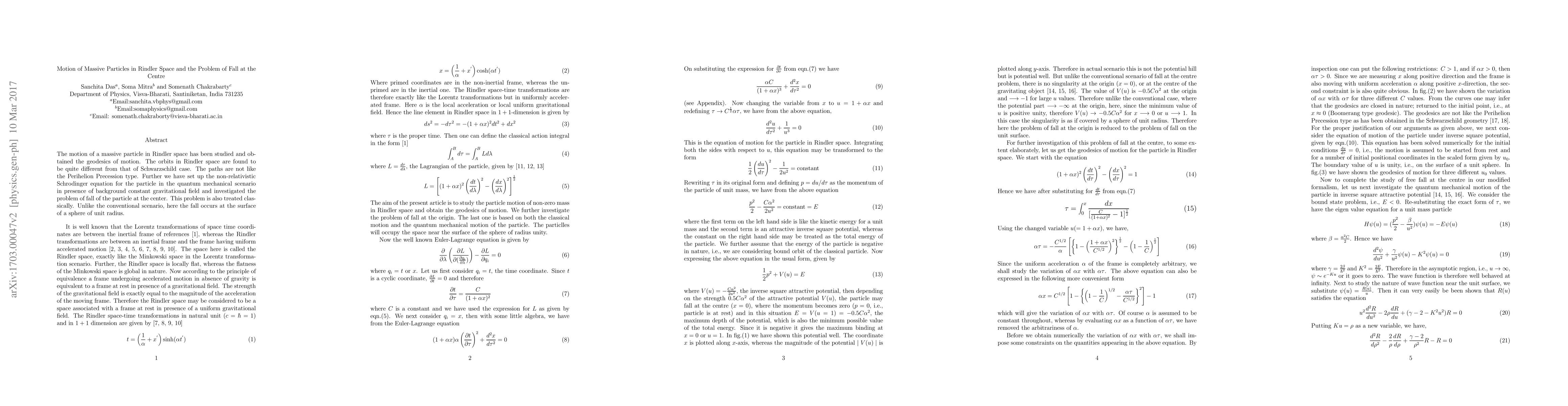 Summary: The study investigates the motion of massive particles in Rindler space, deriving unique geodesics distinct from the Schwarzschild case, and explores both classical and quantum mechanical scenarios for the particle's fall at the center, which occurs at a unit radius sphere instead of the conventional location.