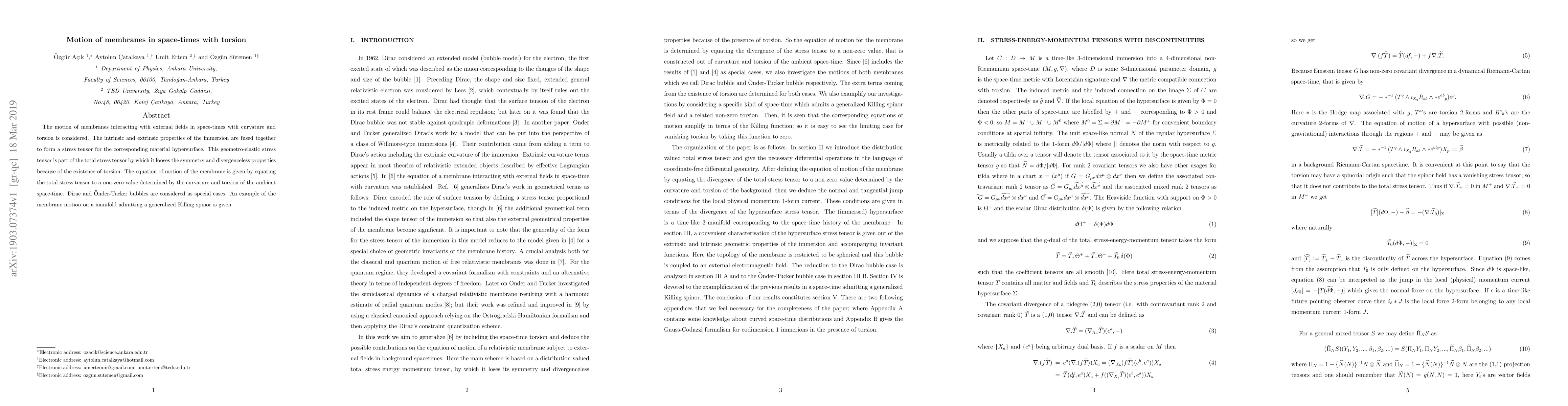 This paper investigates the dynamics of membranes in space-times with both curvature and torsion, deriving a geometro-elastic stress tensor that accounts for the membrane's intrinsic and extrinsic properties. The study concludes with equations of motion for the membrane, influenced by the ambient space-time's curvature and torsion, and examines specific cases like Dirac and "Onder-Tucker bubbles.