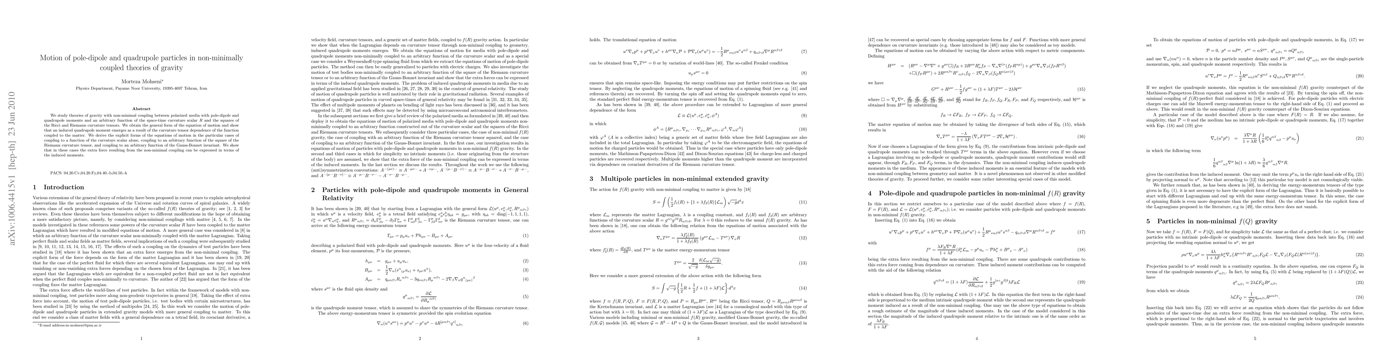 We study theories of gravity with non-minimal coupling between polarized media with pole-dipole and quadrupole moments and an arbitrary function of the space-time curvature scalar $R$ and the squares of the Ricci and Riemann curvature tensors. We obtain the general form of the equation of motion and show that an induced quadrupole moment emerges as a result of the curvature tensor dependence of the function coupled to the matter. We derive the explicit forms of the equations of motion in the particular cases of coupling to a function of the curvature scalar alone, coupling to an arbitrary function of the square of the Riemann curvature tensor, and coupling to an arbitrary function of the Gauss-Bonnet invariant. We show that in these cases the extra force resulting from the non-minimal coupling can be expressed in terms of the induced moments.