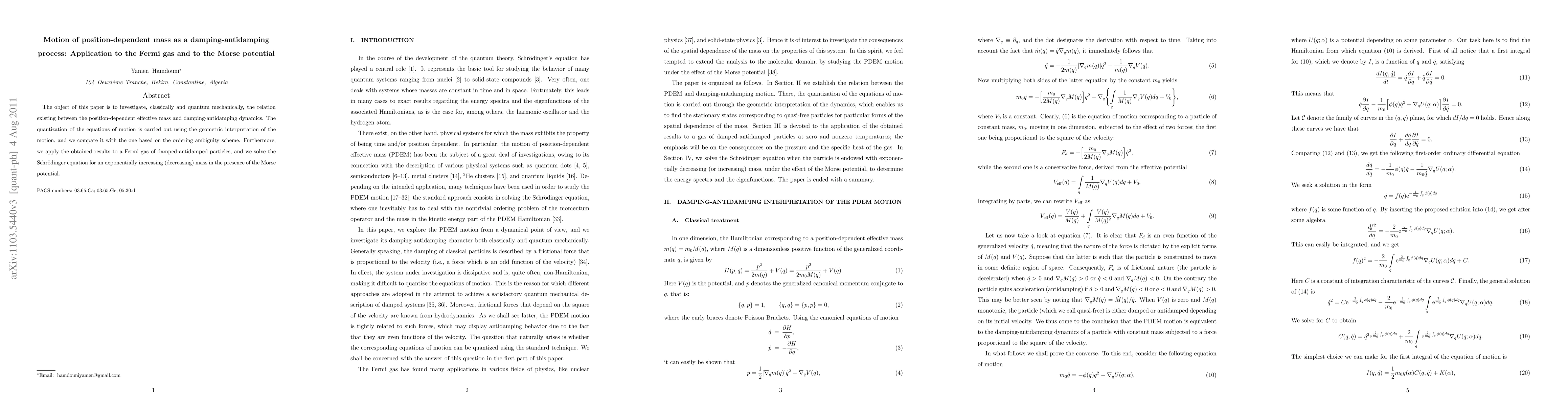 This paper explores the classical and quantum mechanical dynamics of position-dependent mass, linking it to damping-antidamping processes. It quantizes the motion using geometric interpretation and compares it with the ordering ambiguity scheme, then applies these findings to Fermi gas and the Schrödinger equation for a Morse potential with variable mass.
