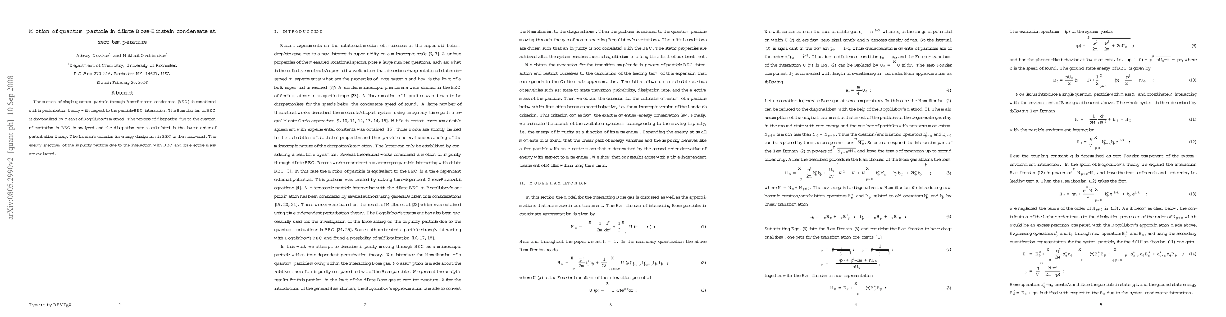 This paper investigates the motion of a single quantum particle in a dilute Bose-Einstein condensate (BEC) using perturbation theory. It analyzes dissipation due to excitation creation and calculates the dissipation rate, recovering Landau's criterion for energy dissipation, and evaluates the energy spectrum and effective mass of the impurity particle.
