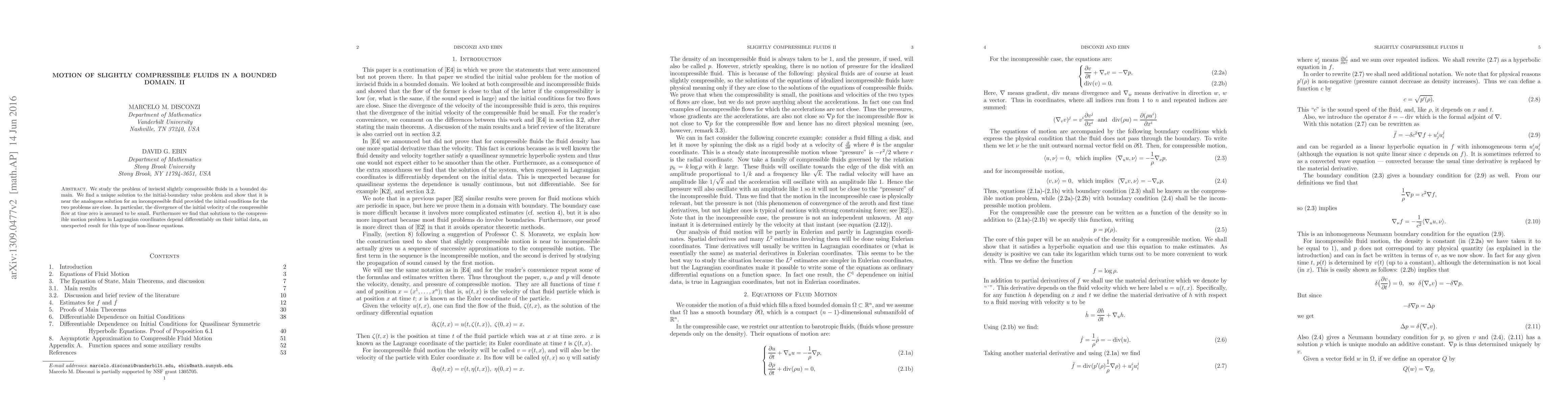 We study the problem of inviscid slightly compressible fluids in a bounded domain. We find a unique solution to the initial-boundary value problem and show that it is near the analogous solution for an incompressible fluid provided the initial conditions for the two problems are close. In particular, the divergence of the initial velocity of the compressible flow at time zero is assumed to be small. Furthermore we find that solutions to the compressible motion problem in Lagrangian coordinates depend differentiably on their initial data, an unexpected result for this type of non-linear equations.