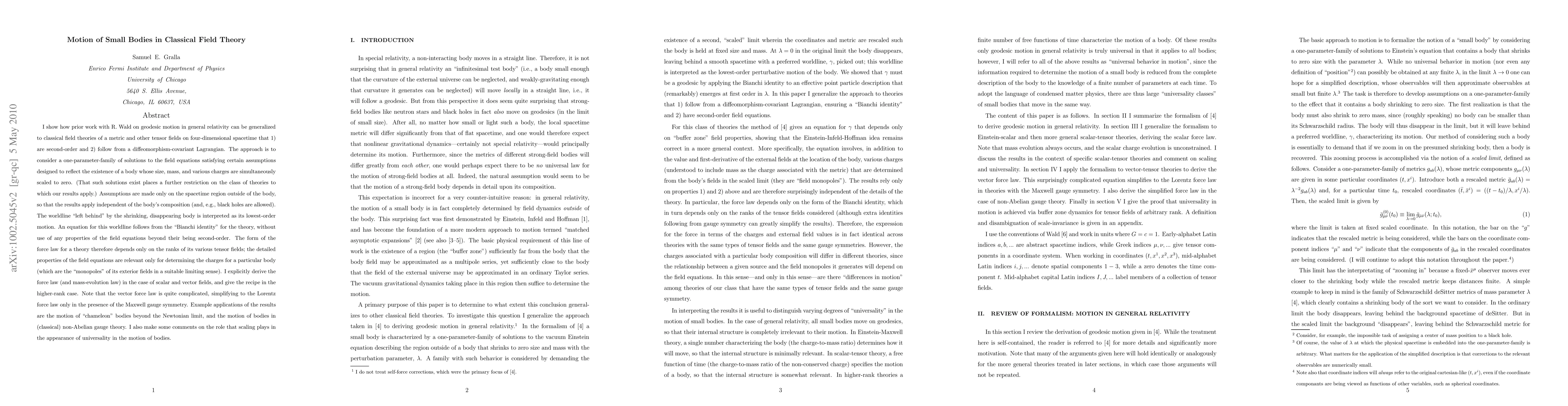Researchers develop a general framework for understanding the motion of small bodies in classical field theories, providing equations for force laws that depend on tensor fields' ranks, applicable to ordinary bodies and black holes.