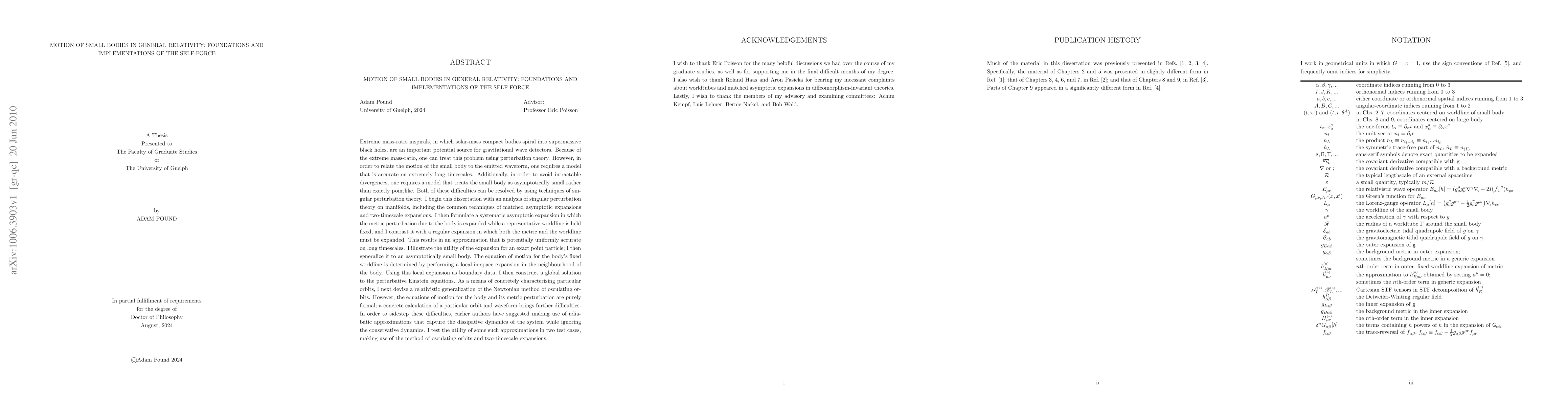This research paper uses singular perturbation theory to analyze the motion of small bodies in general relativity, providing a new framework for modeling extreme mass-ratio inspirals and predicting gravitational wave signals.