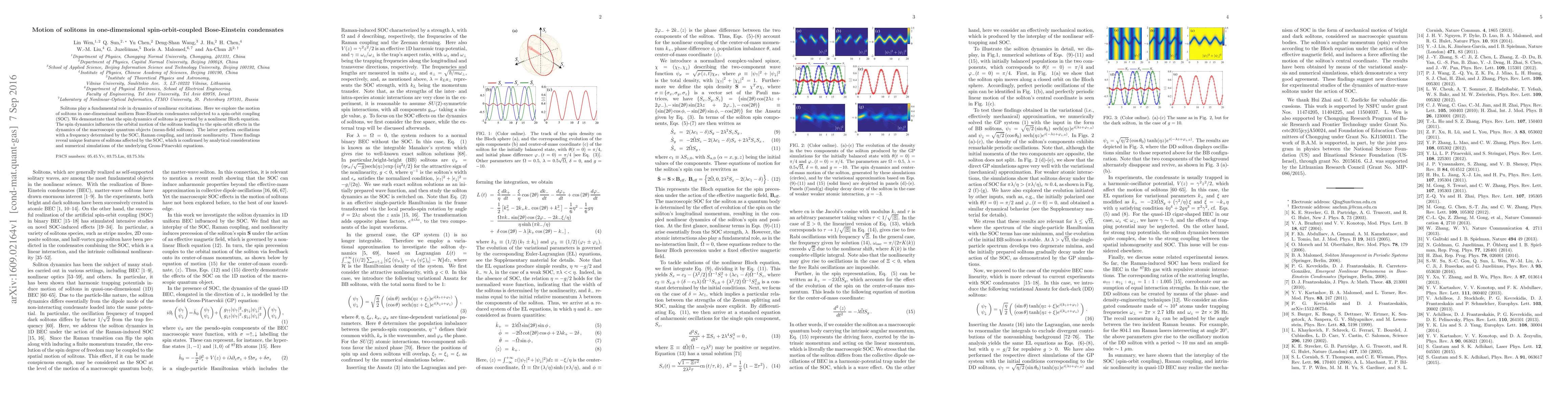 The paper presents a detailed analysis of soliton motion in spin-orbit-coupled Bose-Einstein condensates, introducing a nonlinear Bloch equation to describe the spin dynamics and demonstrating the influence on orbital motion.