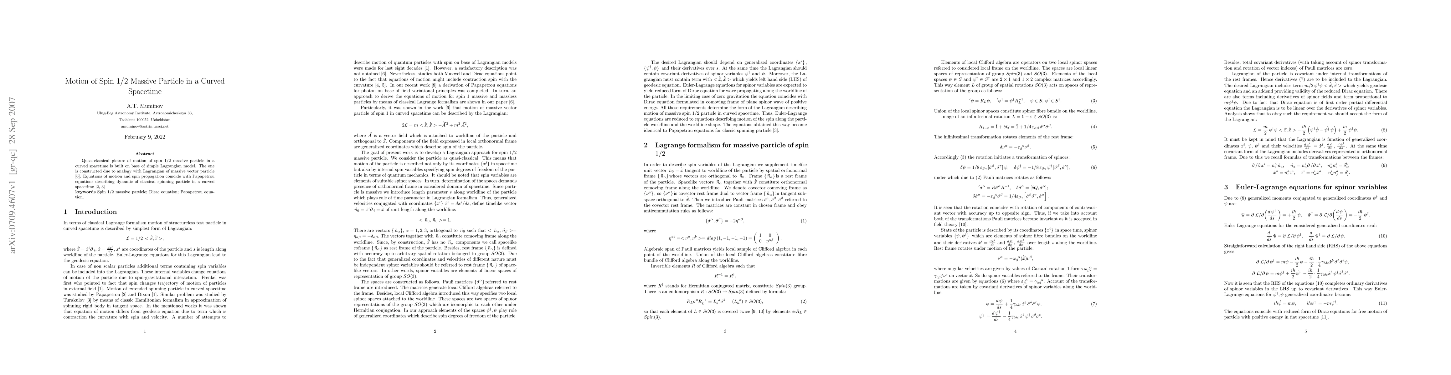 This research constructs a Lagrangian model for a spin 1/2 massive particle in curved spacetime, analogous to the Lagrangian for massive vector particles. The derived equations of motion match the Papapetrou equations for classical spinning particles in such environments.